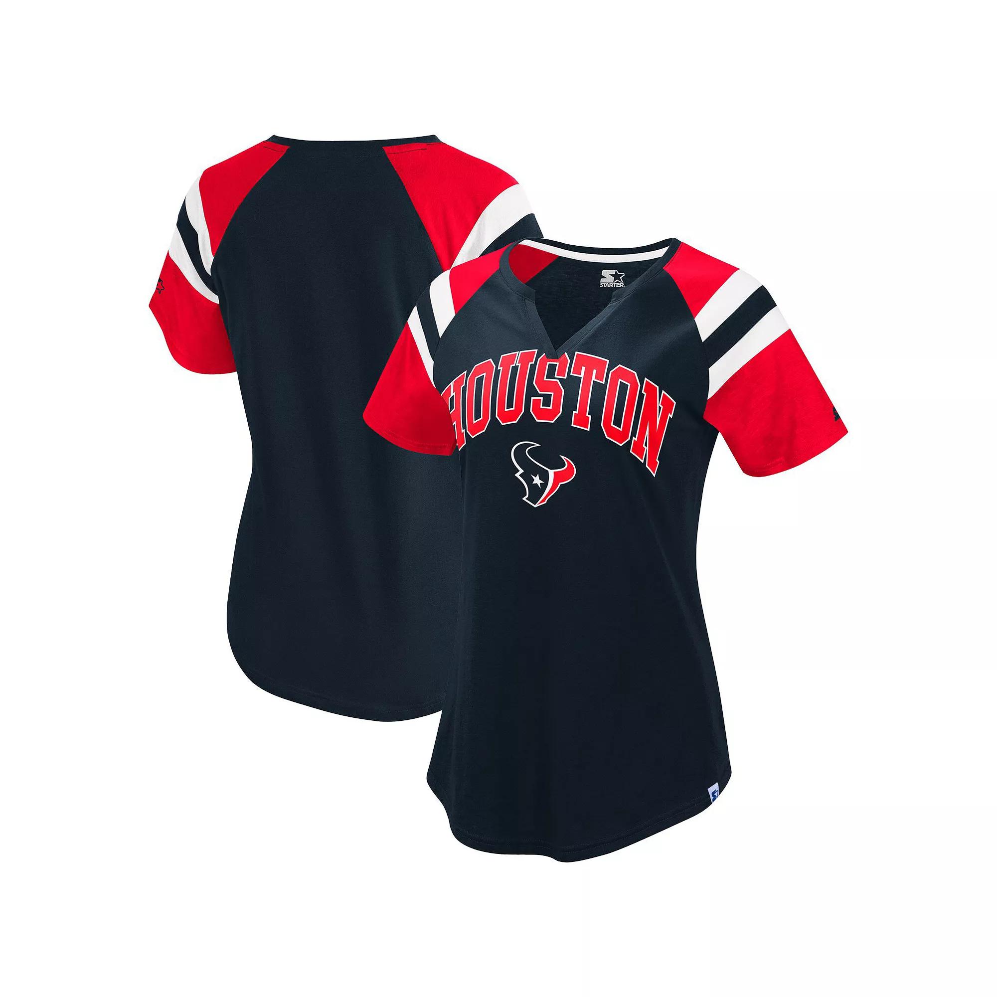 Get ready to cheer on the Houston Texans with this stylish Game On Notch Neck Raglan T-Shirt from Starter. This stylish tee features raglan sleeves for increased range of motion, ensuring comfort whether youre cheering from the stands or celebrating a victory. The screen-printed arched team wordmark and logo at the front boldly display your Houston Texans pride.Get ready to cheer on the Houston Texans with this stylish Game On Notch Neck Raglan T-Shirt from Starter. This stylish tee features raglan sleeves for increased range of motion, ensuring comfort whether youre cheering from the stands or celebrating a victory. The screen-printed arched team wordmark and logo at the front boldly display your Houston Texans pride.PRODUCT FEATURESNotch neckShort sleeveMachine wash, tumble dry lowRounded hemSewn-on, contrast-color stripesOfficially licensedMaterial: 60% Cotton/40% PolyesterScreen print arched team wordmark and logo at frontImportedRaglan sleeves for increased range of motionBrand: Starter Color: Navy. Gender: female. Age Group: adult.