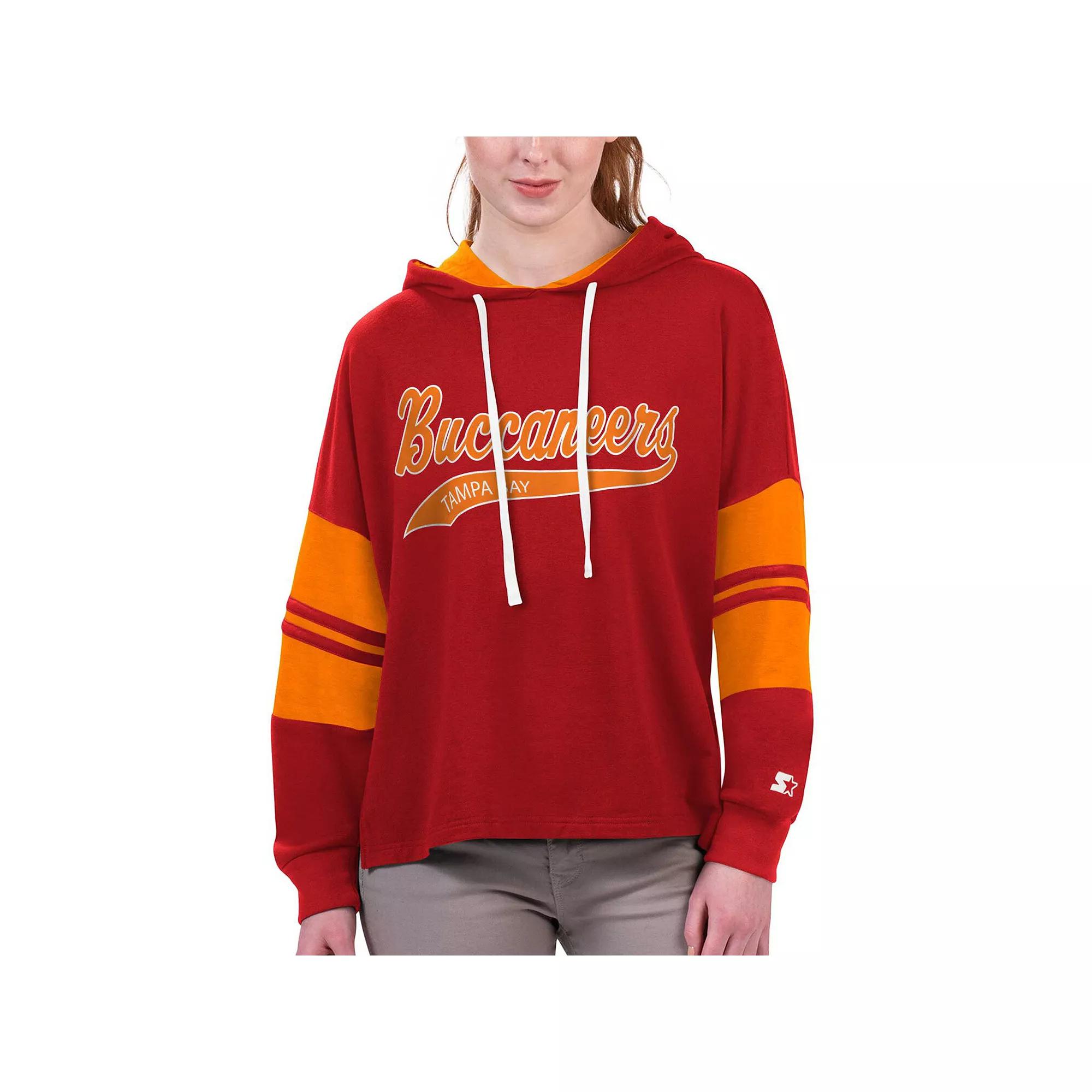 The Women's Starter Red Tampa Bay Buccaneers Bump And Run Long Sleeve Hoodie T-Shirt is the perfect way to show your unwavering support for the Tampa Bay Buccaneers. This lightweight hoodie features screen-print graphics and sewn-in contrasting color stripes that proudly display your team spirit. The droptail hem with side splits and ribbed cuffs provide a comfortable and stylish fit, while the French terry lining ensures warmth on chilly game days. Whether you're cheering from the stands or simply showing your support, this hoodie is a must-have for any true Tampa Bay Buccaneers fan. Hooded. Screen-print graphics. Imported. Brand: Starter. French terry lining. Sewn in contrasting color stripes. Officially licensed. Droptail hem with side splits. Ribbed cuffs. Contrasting color hood lining. Long sleeve. Material: 55% Cotton/40% Modal/5% Spandex. Lightweight hoodie suitable for mild temperatures. Machine wash, tumble dry low. Size: XL. Gender: female. Age Group: adult.