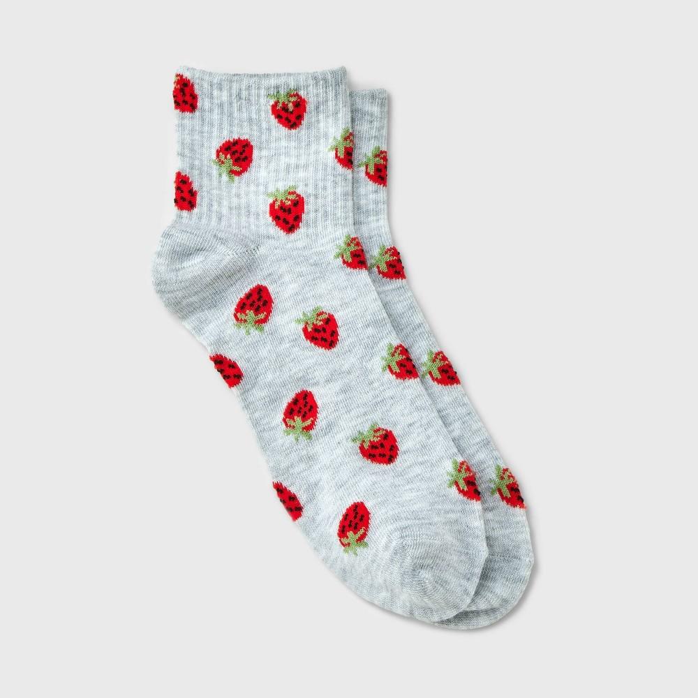 Add vibrant prints to your sock collection with these Womens Strawberries Ribbed Ankle Socks - Heather Gray/Red 4-10. Made from lightweight fabric, it offers all day comfort. These socks come with added spandex that will stay in place for a secure fit. Suitable for everyday use, these ribbed ankle socks make a practical addition to your wardrobe essentials.