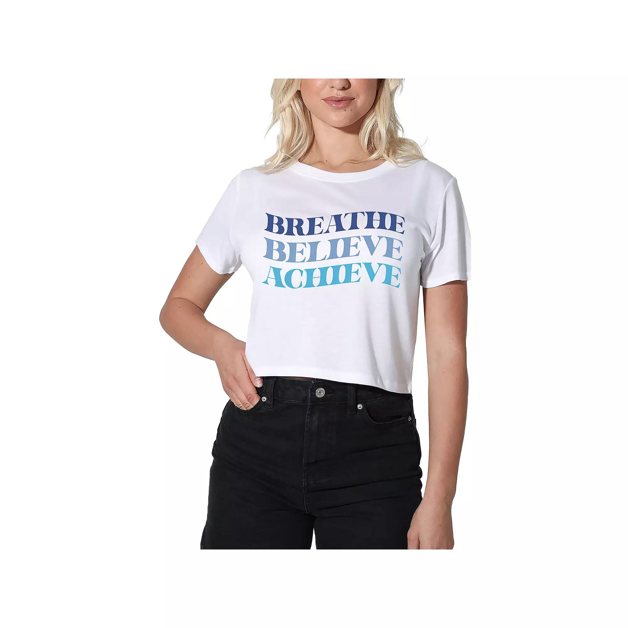 You'll love this Women's Suburban Riot Breathe Believe Achieve Crop Tee.You'll love this Women's Suburban Riot Breathe Believe Achieve Crop Tee.FEATURES Crafted from high-quality ultrasoft cotton tri-blend, this midriff-flattering graphic crop tee was designed with day-to-night versatility in mind. Short sleeves CrewneckFABRIC & CARE Cotton, polyester, rayon Machine wash and tumble dry low Imported Size: Medium. Color: White. Gender: female. Age Group: kids. Material: Cotton Blend.