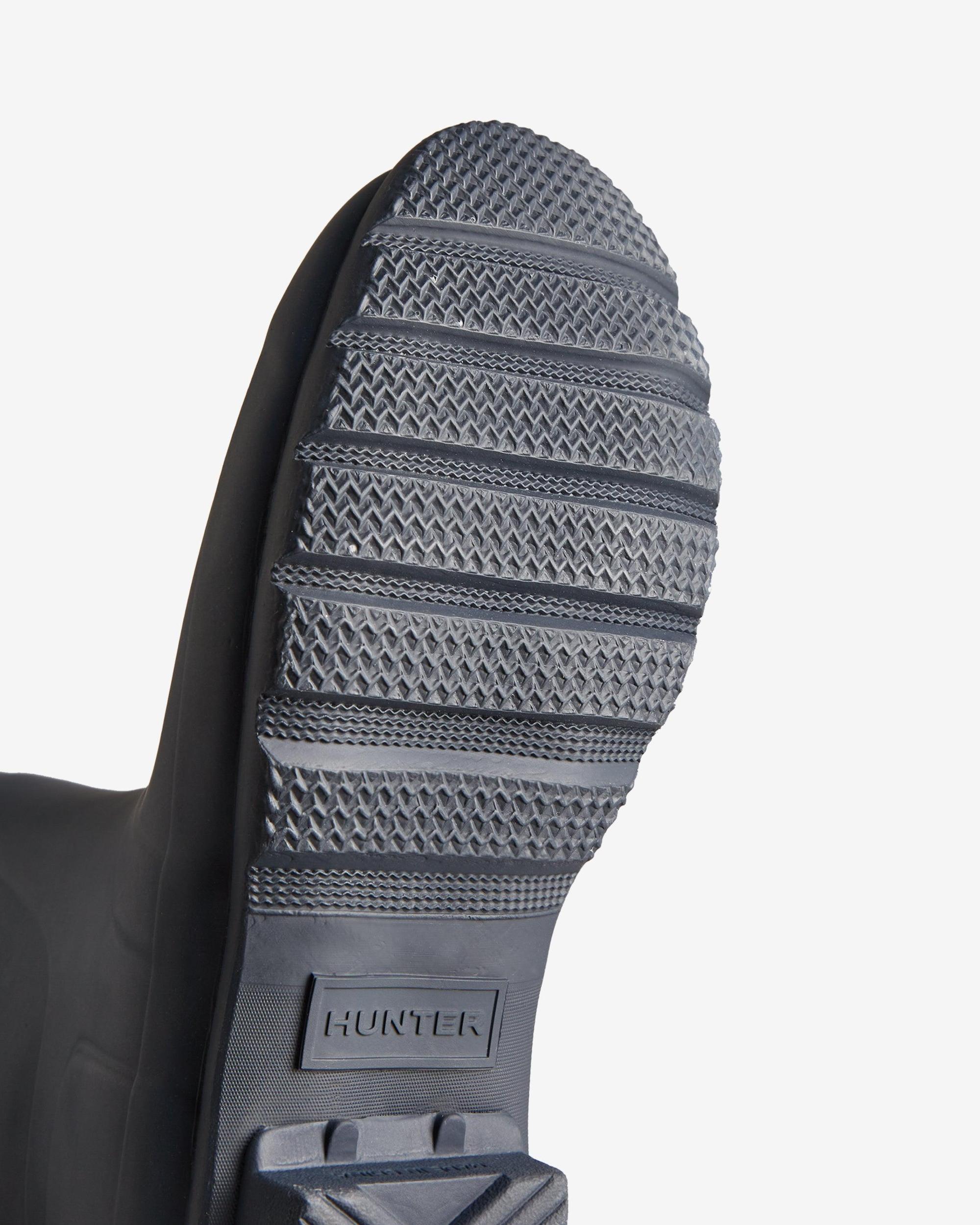 Women's Tall Back Adjustable Wellington Boots Size/Fit Summary: True to size, Regular fit with back adjustability. Designed for a flexible fit, the Original Tall Adjustable Boot mirrors the iconic Original Tall with the addition of an expandable gusset at the back. Perfect for a wider calf, these matte wellies in classic navy offer ease of movement and adjust from the traditional tailored Hunter fit to a more relaxed shape when the gusset is fully extended. Handcrafted from natural rubber, the Original Adjustable boot is fully waterproof with a comfortable polyester lining and the signature Hunter Original tread. We recommend that all Hunter boots be worn with socks to protect the wearer's skin from contact with rubber.