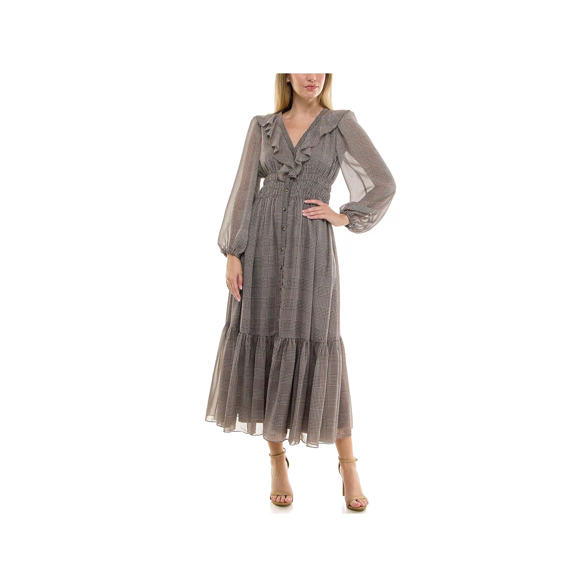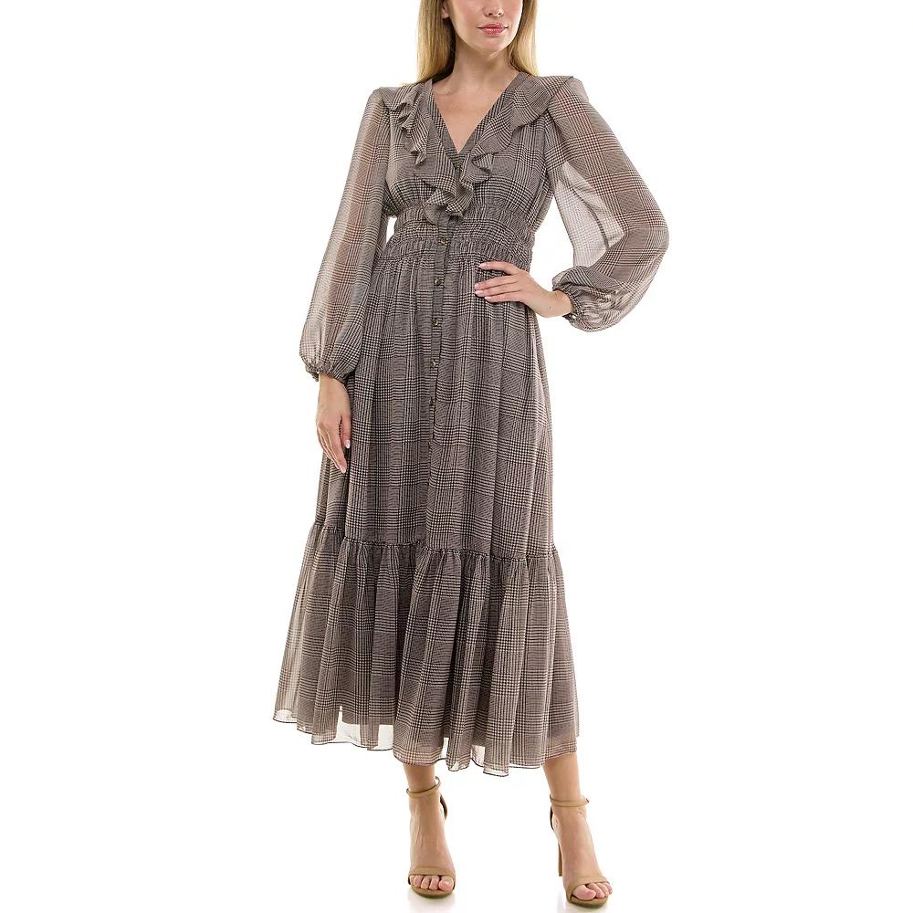 Embrace effortless elegance with this captivating dress by Taylor, featuring a charming ruffle neckline and a flattering smocked waist. The flowy silhouette adorned with a chic plaid print makes it perfect for both casual outings and special occasions, allowing for versatile styling that will make you feel beautifully confident and stylish. Click on this WOMEN'S GUIDE to find the perfect fit and more! - https://www.kohls.com/feature/womens-fit-guide.jsp. FIT & SIZE: Women's Reg, Fit & flare silhouette, Maxi length hits at the ankle, 53 1/4-in. length from shoulder to hem, Ruffled hemline, Smocked waistband. DETAILS: Button front closure, Ruffled v-neck, Long sleeves, Set-in sleeves, Elastic cuffs, Pocket at each side seam, Imported. MATERIAL & CARE: Plaid print construction, Smooth feel, Polyester, Hand wash. Size: 16. Color: Brown Plaid. Gender: female. Age Group: adult. Material: WOVEN.