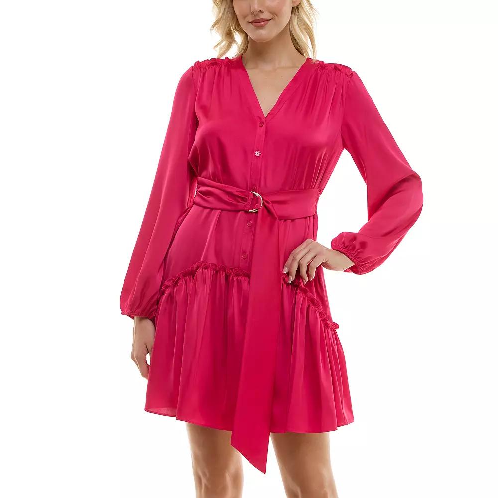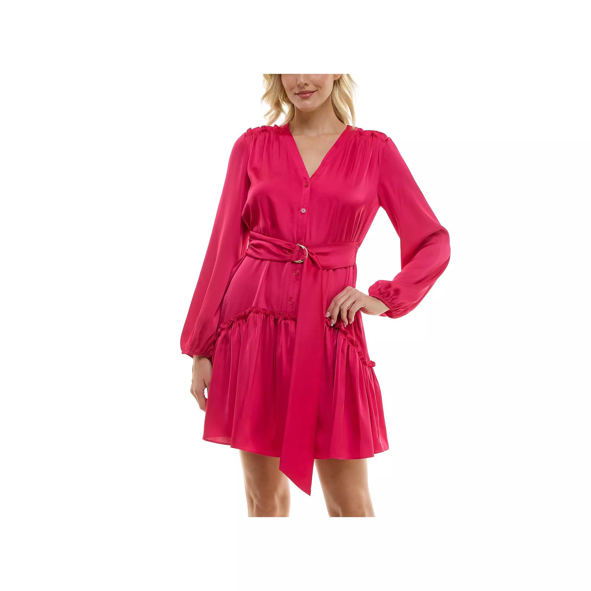This fashionable satin asymmetrical ruffle hem fit and flare mini dress from Taylor is sure to quickly become a favorite in your wardrobe.Click on this WOMEN'S GUIDE to find the perfect fit and more!This fashionable satin asymmetrical ruffle hem fit and flare mini dress from Taylor is sure to quickly become a favorite in your wardrobe. Click on this WOMEN'S GUIDE to find the perfect fit and more!FEATURES Fit & flare silhouette No closure - pullover styling V-neck Long, set-in sleeves Elastic cuffs Contour waistband with coordinating sash Assymetrical and ruffled hem Satin construction UnlinedFIT & SIZING Cinched waist fit 36 1/2-in. length from shoulder to hem Mini length hits at the thighFABRIC & CARE Polyester Hand wash Imported Size: 16. Color: Bright Rose. Gender: female. Age Group: adult.
