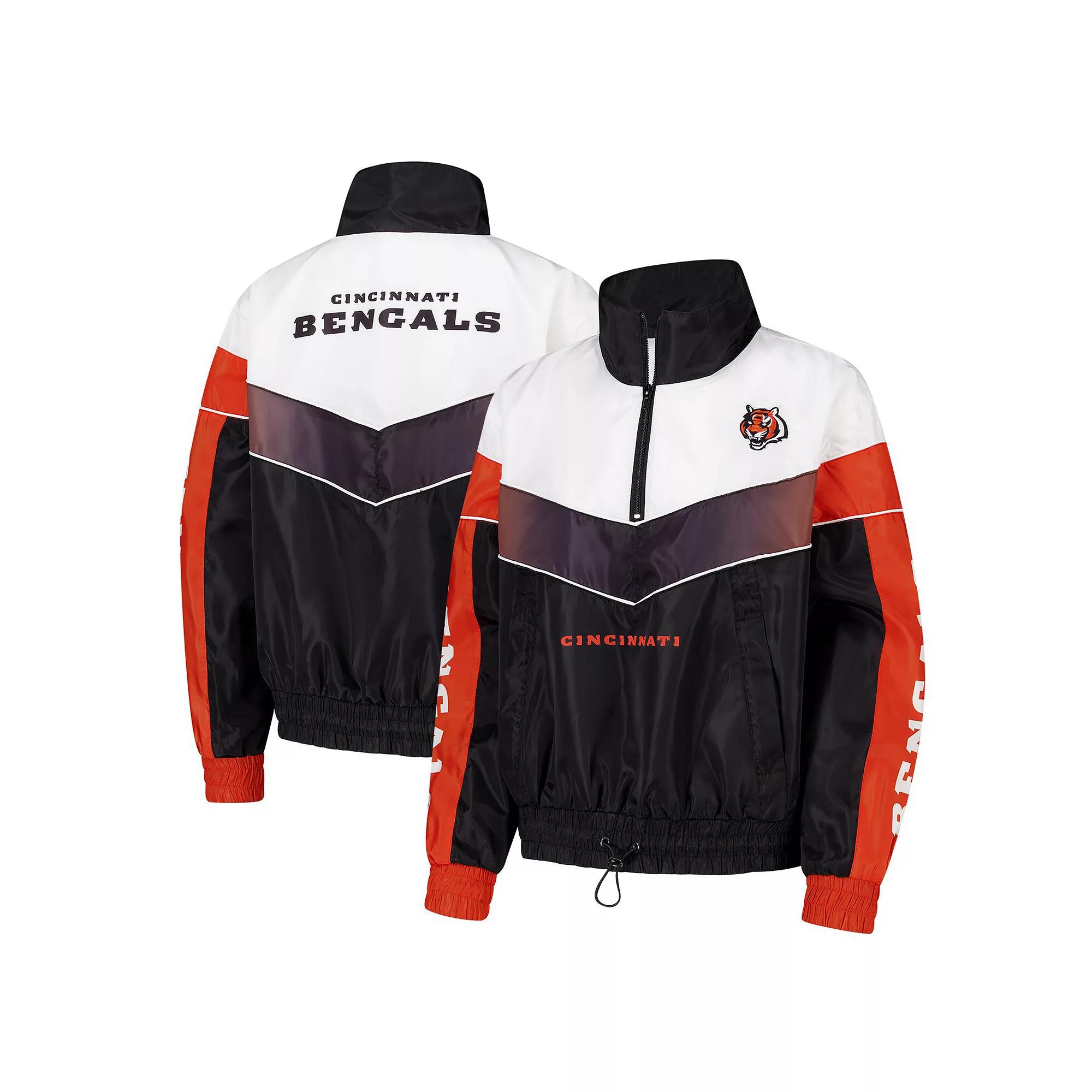 Show your Cincinnati Bengals pride with this 1/4 Zip Track Jacket from The Wild Collective. This stylish track jacket boasts sublimated graphics across the top back and down the sleeves, making a bold statement wherever you go. The lightweight, 100% polyester fabric ensures comfort, while the embroidered team logo and heat-sealed wordmark proudly display your Bengals pride.Show your Cincinnati Bengals pride with this 1/4 Zip Track Jacket from The Wild Collective. This stylish track jacket boasts sublimated graphics across the top back and down the sleeves, making a bold statement wherever you go. The lightweight, 100% polyester fabric ensures comfort, while the embroidered team logo and heat-sealed wordmark proudly display your Bengals pride.PRODUCT FEATURESLong sleeveOfficially licensedMaterial: 100% PolyesterHem with pullcord and toggle closureFront pouch pocket with zippered closureMachine wash with garment inside out, tumble dry lowElastic cuffs and hem1/4-ZipMock neckBrand: The Wild CollectiveHeat-sealed team wordmark across bottom frontSublimated graphics across top back and down sleevesLightweight jacket suitable for mild temperaturesEmbroidered team logo at left chestImportedContrast color piping Color: Black. Gender: female. Age Group: adult.