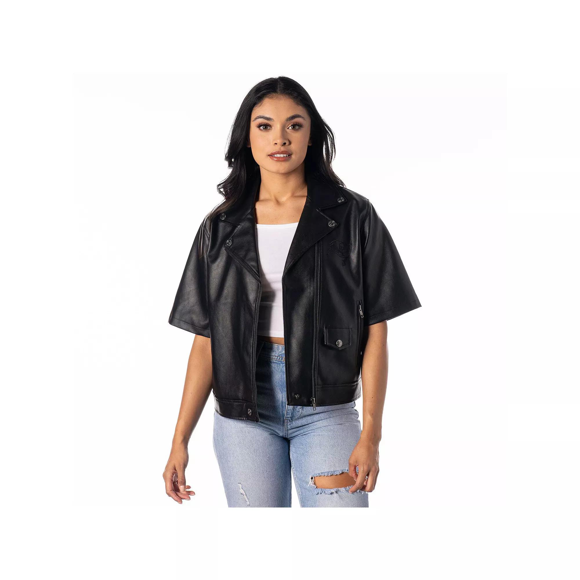 Amp up your Tampa Bay Buccaneers style with this Faux Leather Moto Short Sleeve Full-Zip Jacket by The Wild Collective. Its edgy design features the sleek look of vegan leather and a monochrome team logo embroidered on the left chest. The polyester lining provides breathability, while zippered pockets keep essentials secure in this sporty Tampa Bay Buccaneers jacket.Amp up your Tampa Bay Buccaneers style with this Faux Leather Moto Short Sleeve Full-Zip Jacket by The Wild Collective. Its edgy design features the sleek look of vegan leather and a monochrome team logo embroidered on the left chest. The polyester lining provides breathability, while zippered pockets keep essentials secure in this sporty Tampa Bay Buccaneers jacket.PRODUCT FEATURESDry clean onlyMaterial: 100% Faux Leather - Body; 100% Polyester - LiningOne-snap pocket on bottom frontOfficially licensedLinedTwo side zippered pocketsVegan leather materialBrand: The Wild CollectiveImportedMonochrome team logo embroidered at left chestMidweight jacket suitable for moderate temperaturesFull ZipOne snap at bottom of zipperTwo-snap collarLocker loopShort sleeve Size: XL. Color: Black. Gender: female. Age Group: adult.