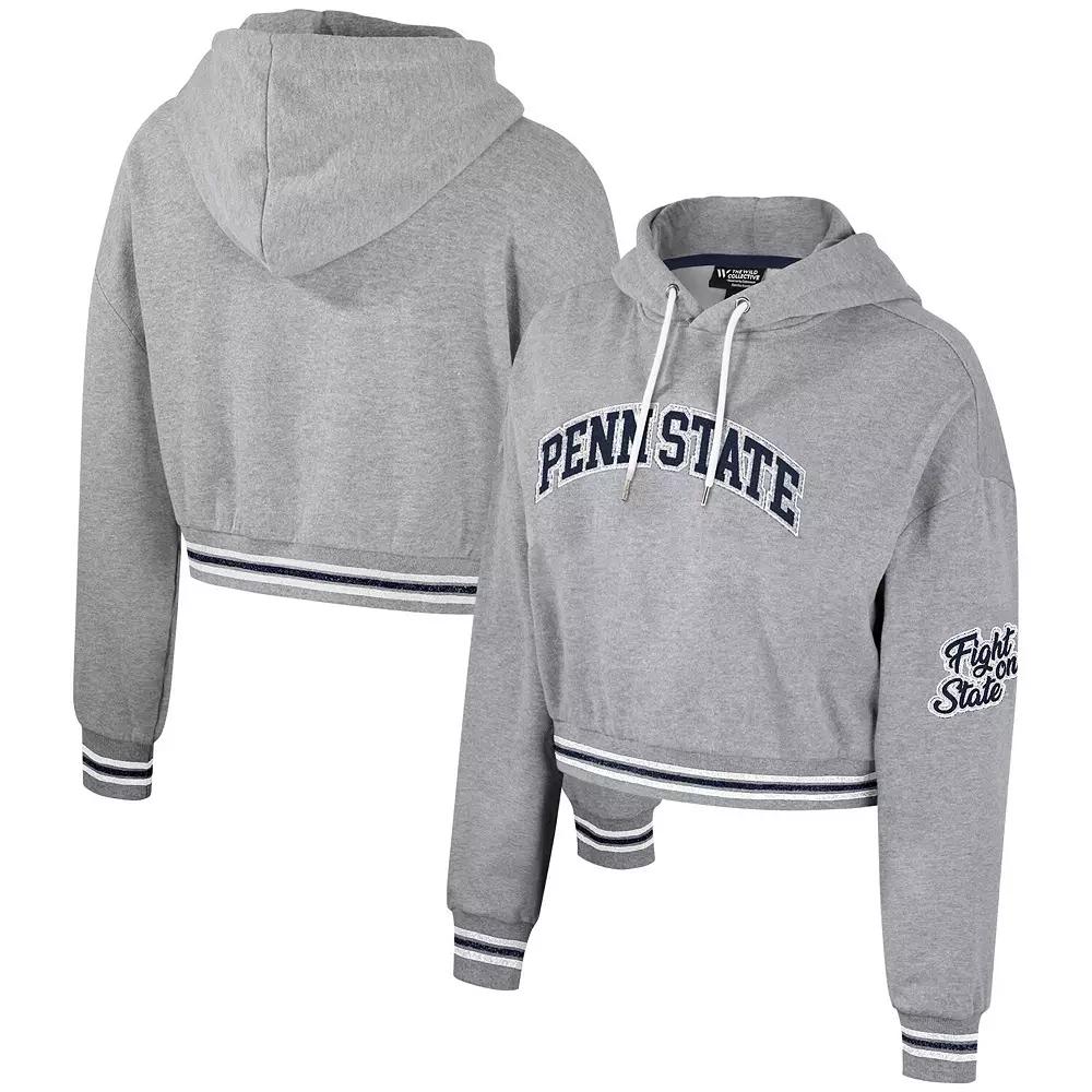 This Cropped Shimmer hoodie from The Wild Collective offers the right amount of Penn State Nittany Lions spirit for a cooler game day. This pullover hoodie features a bold Penn State Nittany Lions wordmark centered on the chest and along the left sleeve with sequin details to help your love for the squad shine brilliantly. The distressed team-colored stripes on the cuffs and waist add a subtle boost to the team-inspired look, while the cropped design makes this the perfect grab for a chic look.This Cropped Shimmer hoodie from The Wild Collective offers the right amount of Penn State Nittany Lions spirit for a cooler game day. This pullover hoodie features a bold Penn State Nittany Lions wordmark centered on the chest and along the left sleeve with sequin details to help your love for the squad shine brilliantly. The distressed team-colored stripes on the cuffs and waist add a subtle boost to the team-inspired look, while the cropped design makes this the perfect grab for a chic look.Machine wash, line dryPulloverMaterial: 60% Cotton/40% PolyesterDistressed details for a vintage lookLong sleeveCroppedHoodedOfficially licensedImportedEmbroidered fabric appliqueSequin detailsBrand: The Wild CollectiveEmbroidered graphicsDropped shoulders Color: Grey. Gender: female. Age Group: adult.