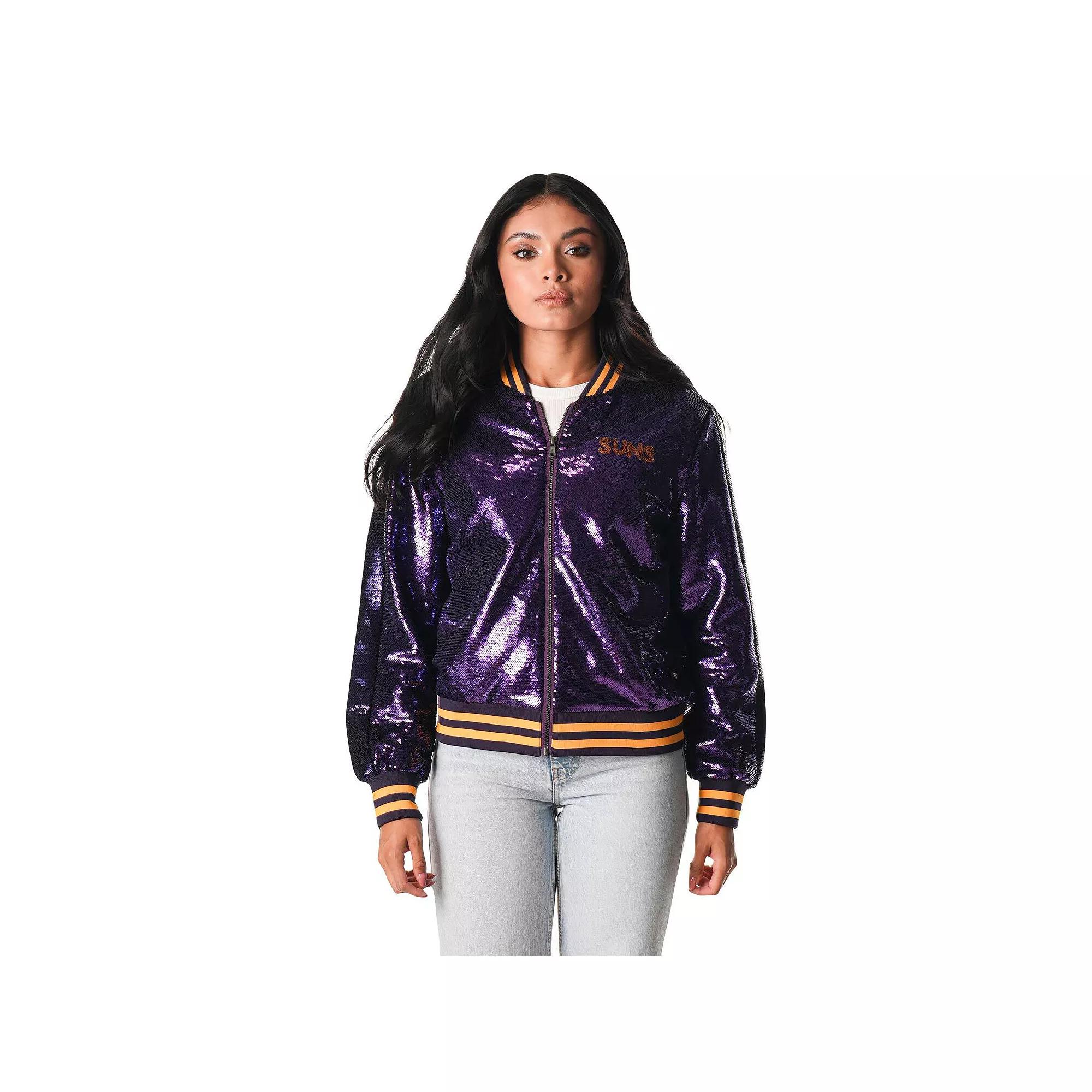 Show off your Phoenix Suns pride with this The Wild Collective Sequin Bomber Full-Zip Jacket. This eye-catching bomber jacket features all-over sequin detail and sequin graphics, adding a touch of glam to your game-day attire. The sublimated rib-knit collar, cuffs, and waistband provide a snug and comfortable fit, making it perfect for cheering on the Phoenix Suns in style.Show off your Phoenix Suns pride with this The Wild Collective Sequin Bomber Full-Zip Jacket. This eye-catching bomber jacket features all-over sequin detail and sequin graphics, adding a touch of glam to your game-day attire. The sublimated rib-knit collar, cuffs, and waistband provide a snug and comfortable fit, making it perfect for cheering on the Phoenix Suns in style.PRODUCT FEATURESSublimated rib-knit collar, cuffs and waistband for a snug and comfortable fitLong sleeveAll-over sequin detailImportedMidweight jacket suitable for moderate temperaturesSequin graphics on left chest and backBrand: The Wild CollectiveMaterial: 100% PolyesterOfficially licensedFull ZipStand-up collarMachine wash, drip dry Size: XL. Color: Phx Purple. Gender: female. Age Group: adult. Material: COTTON.
