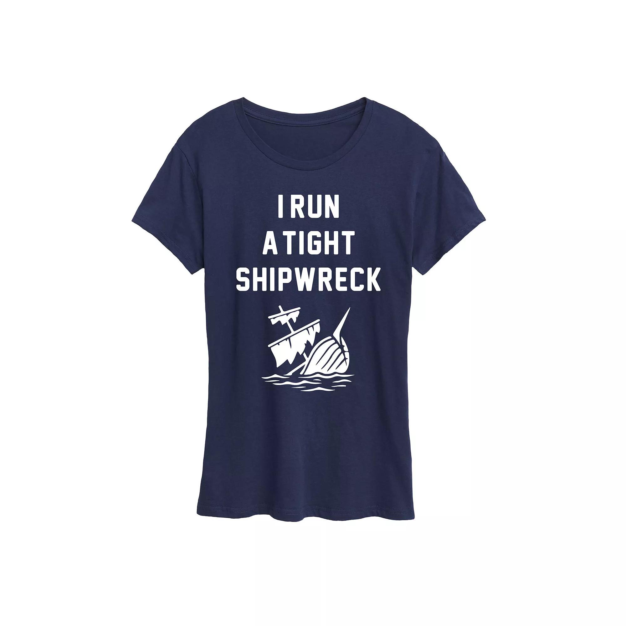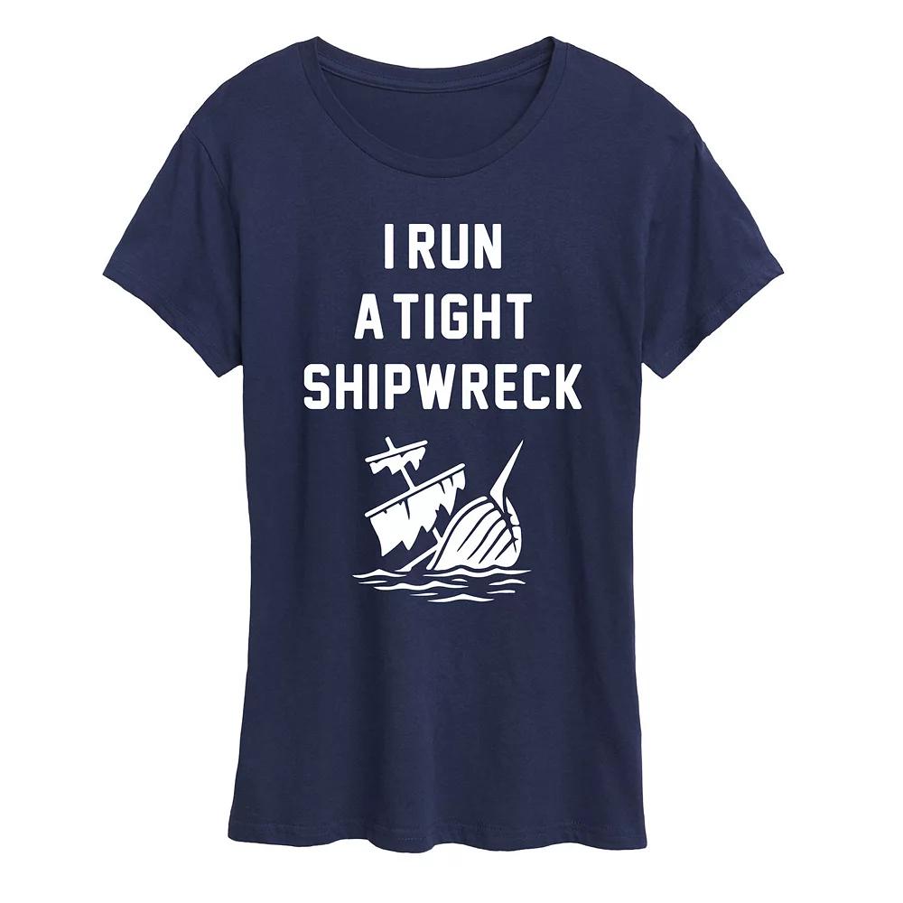 Navy Tight Shipwreck Graphic Tee - Women. Embellished with a sassy graphic that will enliven your casual ensembles, this tee is crafted with ultrasoft cotton and a relaxed fit with an extended length for comfort. Full graphic text: I run a tight shipwreck.Size S: 26 long from high point of shoulder to hemSize & fit: Relaxed-fit garment with a slightly longer hem. Fits true to size.100% cottonMachine wash; tumble dryImported, screen printed in the USA