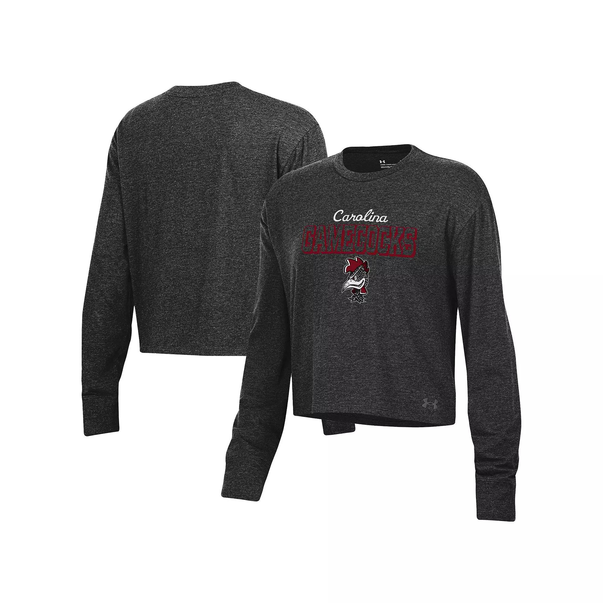 Rep your squad in comfort with this South Carolina Gamecocks Essentials Icon Ultra-Soft Cropped Long Sleeve Tri-Blend Performance T-Shirt from Under Armour. The UA Tech fabric provides unrivaled comfort, making it perfect for all-day wear, while the four-way stretch fabric allows for greater mobility. The iconic team graphics and established year proudly display your South Carolina Gamecocks pride, making it an essential addition to any South Carolina Gamecocks fan's wardrobe. Machine wash with garment inside out, tumble dry low. Set-in collar for a more structured look and feel. Four-way stretch fabric allows for greater mobility. Long sleeve. Crew neck. Imported. Loose fit provides ample room for movement and airflow. Brand: Under Armour. Printed team graphics and established year. Single-dye provides a slightly heathered look. UA logo on bottom left hem. UA Tech fabric is ultra-soft for unrivaled comfort. Officially licensed. Cropped length measures approx. 19. Material: 57% Cotton/38% Polyester/5% Elastane. Size: XL. Color: Charco. Gender: female. Age Group: adult.