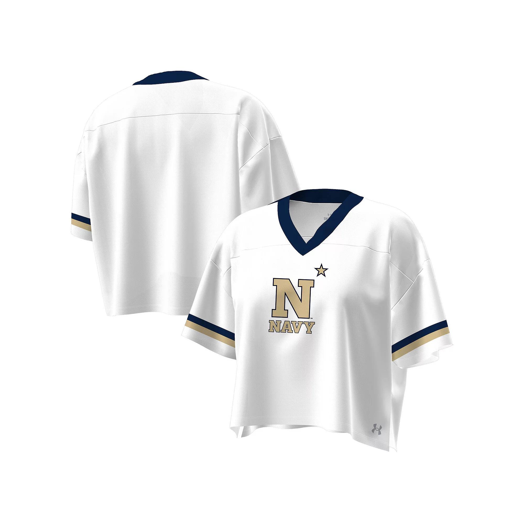 Show off your school spirit in style with this Navy Midshipmen Fashion Jersey Boxy Cropped V-Neck T-Shirt from Under Armour. The boxy fit ensures a relaxed feel and freedom of movement, making it ideal for game day or everyday wear. The cropped hem adds a stylish and modern aesthetic, perfect for showing off your Navy Midshipmen pride with a trendy twist. Imported. Side splits deliver a tailored and flattering fit. Brand: Under Armour. Front and back yoke with trendy dropped shoulders for a casual look. Short sleeve. Boxy fit for a relaxed feel and freedom of movement. Material: 100% Polyester. Cropped length (Measures approx. 19) and adds a stylish and modern aesthetic. Sublimated graphics and sleeve stripes. V-neck. Machine wash with garment inside out, tumble dry low. Officially licensed. Size: XL. Color: White. Gender: female. Age Group: adult. Material: COTTON.