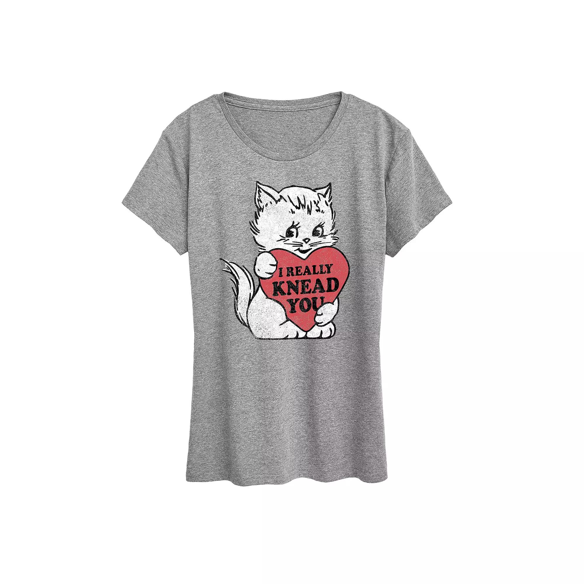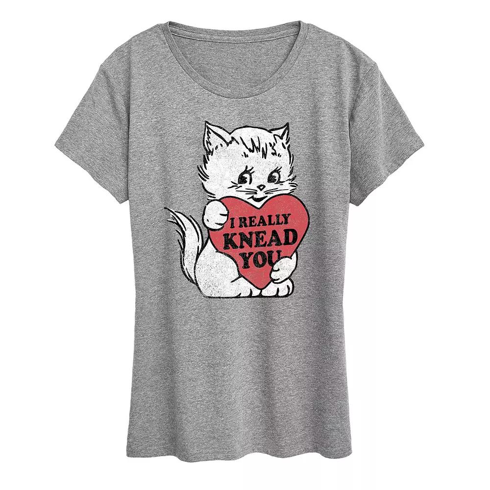 Heather Gray I Really Knead You Valentine Cat Relaxed-Fit Tee - Women, Juniors & Plus. Infuse the days style with a loving sentiment with this breathable graphic tee sporting soft cotton-blend fabric for all-day comfort and easy wear. Full graphic text: I really knead you.Size S: 26 long from high point of shoulder to hem50% cotton / 50% polyesterMachine wash; tumble dryImported, screen printed in the USA