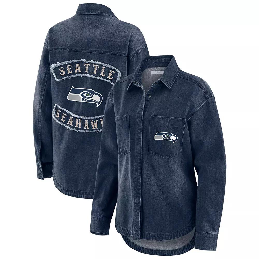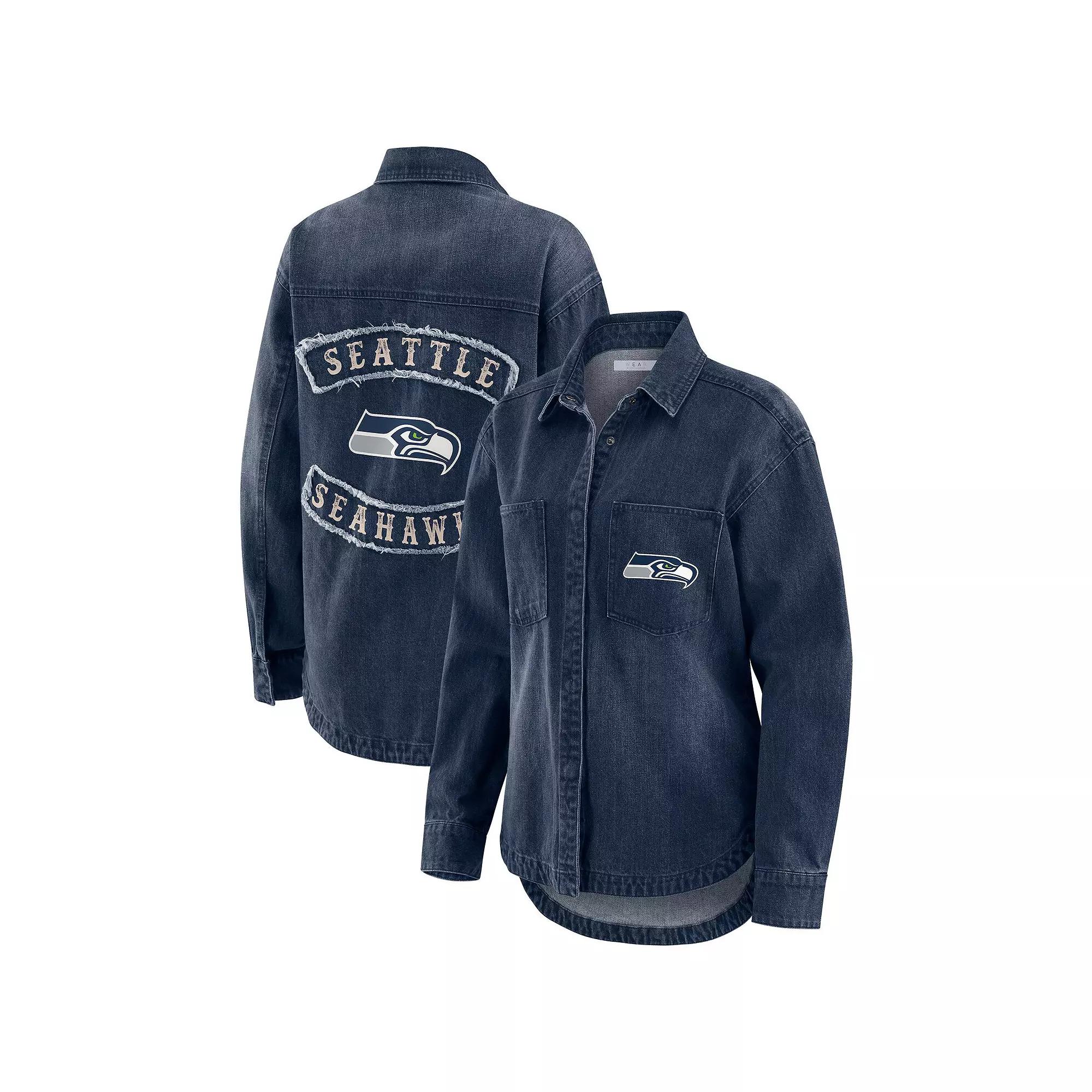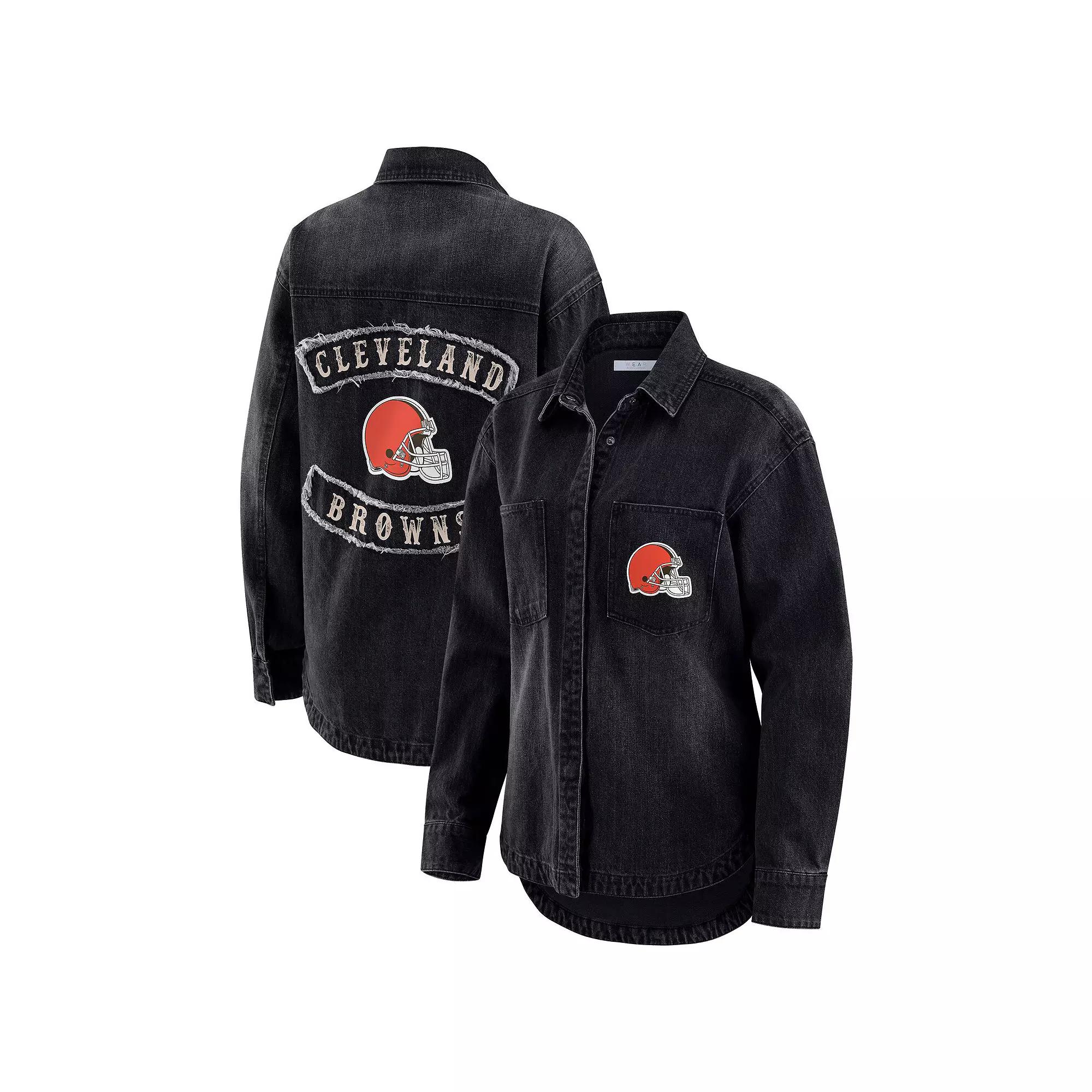 Throw on an extra layer of Cleveland Browns style with this Washed Oversized Denim Full-Snap Shacket from WEAR by Erin Andrews. This shirt-style jacket offers a relaxed fit for comfortable layering and a rounded droptail hem for a flattering silhouette. Screen print Cleveland Browns graphics and a printed wordmark on the back add a touch of team spirit to this fashionable piece. Screen print team graphics at left chest. Relaxed Fit: Loose and roomy across the chest, shoulders and body. Raw-edge fabric applique on back with distressed screen print wordmark. Full Snap. One-snap cuffs. Rounded droptail hem delivers a flattering fit and freedom of movement. Brand: WEAR by Erin Andrews. Material: 94% Cotton/6% Rayon. Machine wash with garment inside out, tumble dry low. Two chest pockets. Officially licensed. Imported. Model is wearing size M and is 5'9. Trendy dropped shoulders for a casual look and relaxed fit. Long sleeve. Color: Black. Gender: female. Age Group: adult.