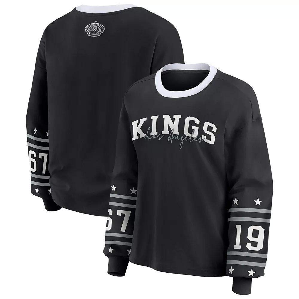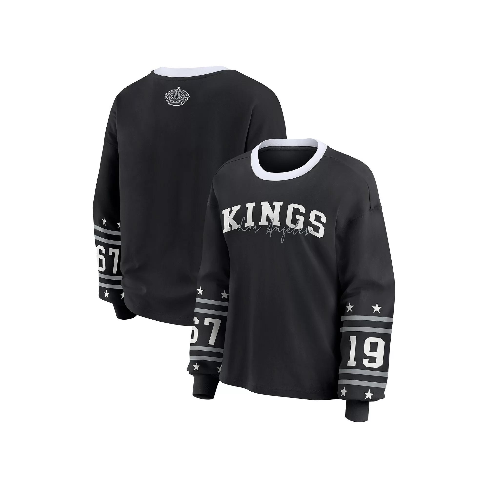 Show off your devotion to the Los Angeles Kings with this Long-Sleeve Sport T-Shirt from WEAR by Erin Andrews. The relaxed fit and dropped shoulder seams provide a comfortable and laid-back feel. Embroidered city name under the screen print team wordmark showcases your Los Angeles Kings pride with style and sophistication. Brand: WEAR by Erin Andrews. Imported. Officially licensed. Embroidered city name under screen print team wordmark. Rib-knit collar and cuffs for a secure fit. Dropped shoulders seams provide a relaxed fit. Machine wash with garment inside out, tumble dry low. Relaxed Fit: Shirt is loose and roomy across the chest, shoulders and body. Crew neck provides a traditional look and is comfortable to wear all day. Long sleeve. Screen print graphics on sleeves and at back neck. Tagless collar with interior taping for a more comfortable feel. Material: 60% Cotton/40% Polyester. Size: XL. Color: Kgs Black. Gender: female. Age Group: adult.