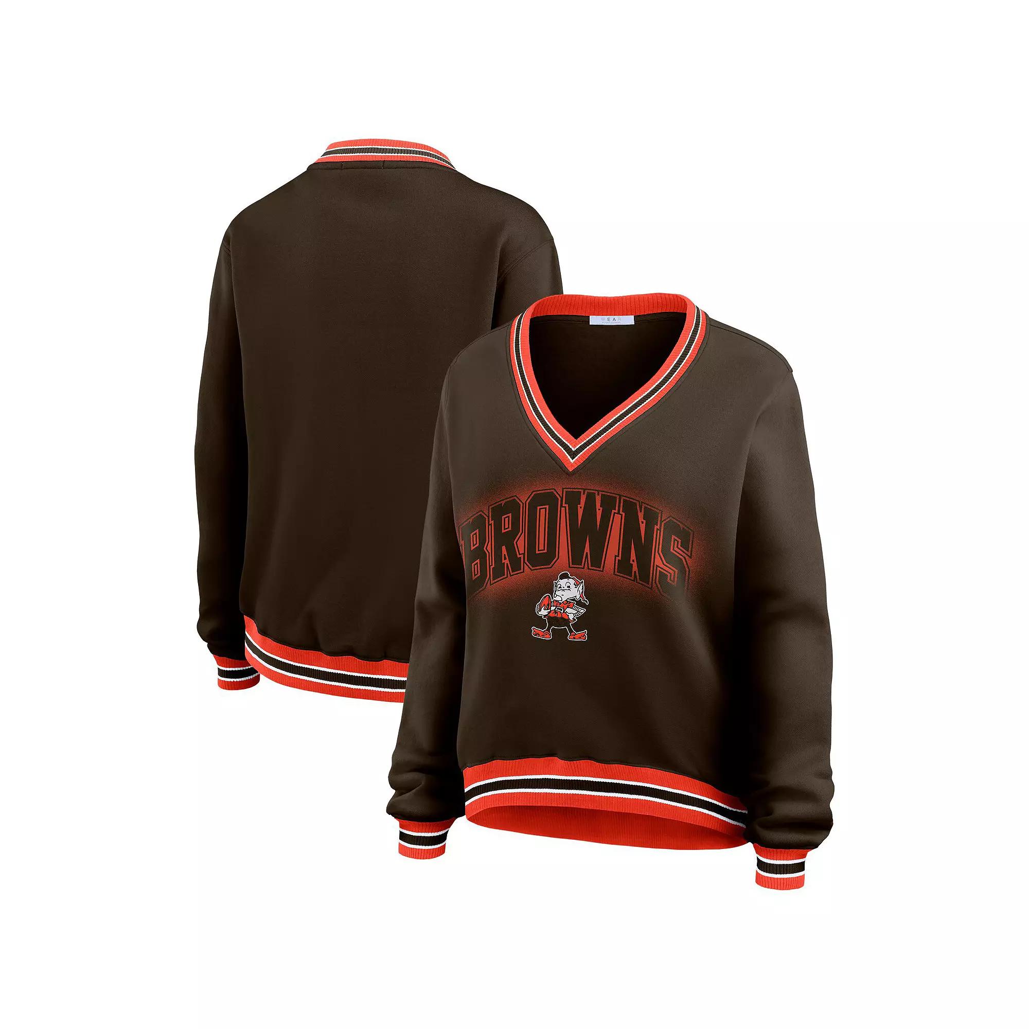 Stay cozy and stylish all season long with this Cleveland Browns Oversized Long Sleeve V-Neck Sweatshirt from WEAR by Erin Andrews. This sweatshirt boasts a relaxed fit with dropped shoulder seams and a luxuriously soft fleece lining for added warmth. The sublimated rib-knit collar, cuffs and waistband provide a touch of style and durability, making it perfect for everyday wear.Stay cozy and stylish all season long with this Cleveland Browns Oversized Long Sleeve V-Neck Sweatshirt from WEAR by Erin Andrews. This sweatshirt boasts a relaxed fit with dropped shoulder seams and a luxuriously soft fleece lining for added warmth. The sublimated rib-knit collar, cuffs and waistband provide a touch of style and durability, making it perfect for everyday wear.PRODUCT FEATURESLong sleeveOfficially licensedV-neckMachine wash, tumble dry lowDropped shoulder seams provide a relaxed fitMaterial: 60% Cotton/40% PolyesterFleece lining provides added warmth and a soft feelPulloverBrand: WEAR by Erin AndrewsSublimated rib-knit collar, cuffs and waistbandScreen print graphic stacked with tackle twill applique on the frontImportedMidweight sweatshirt suitable for moderate temperatures Gender: female. Age Group: adult.