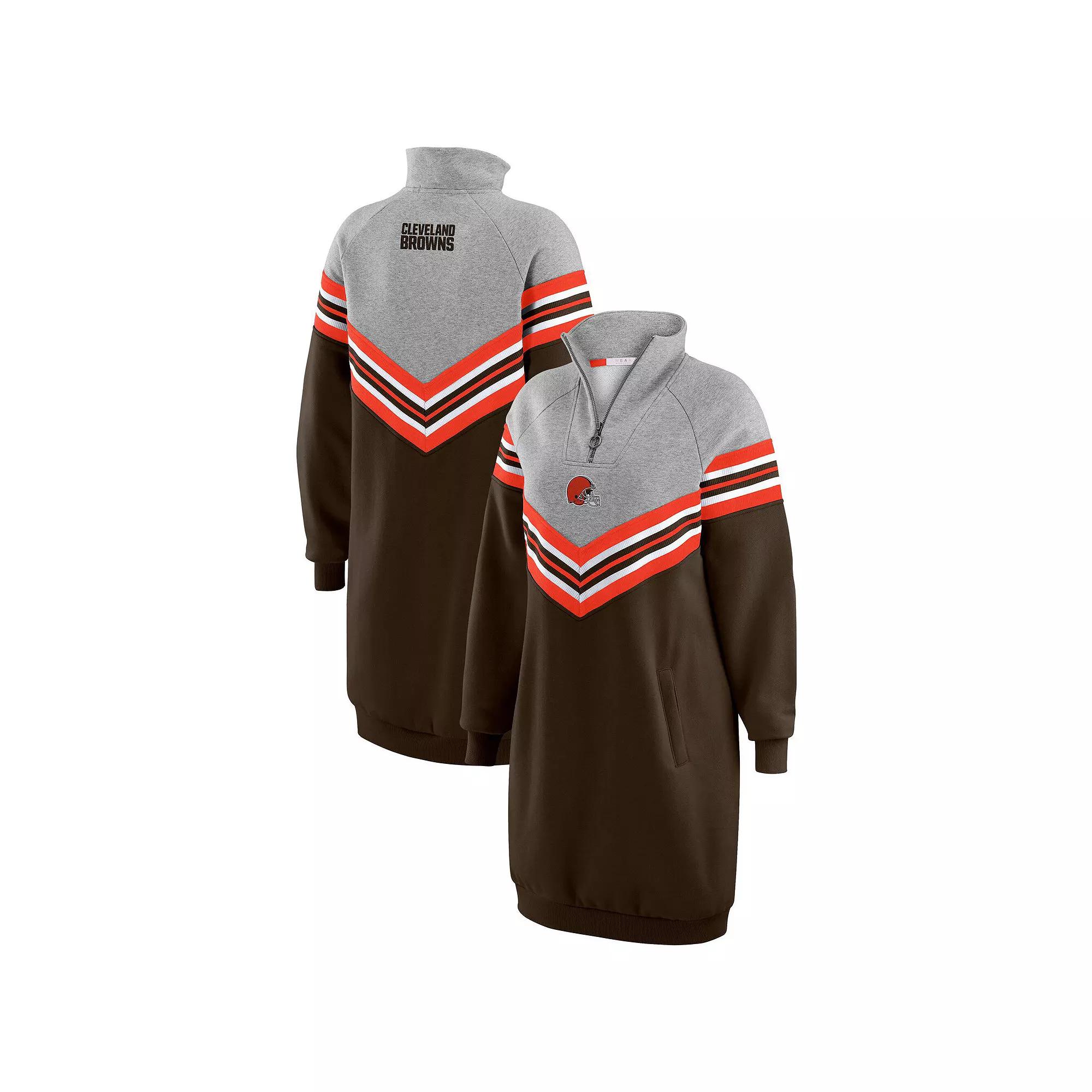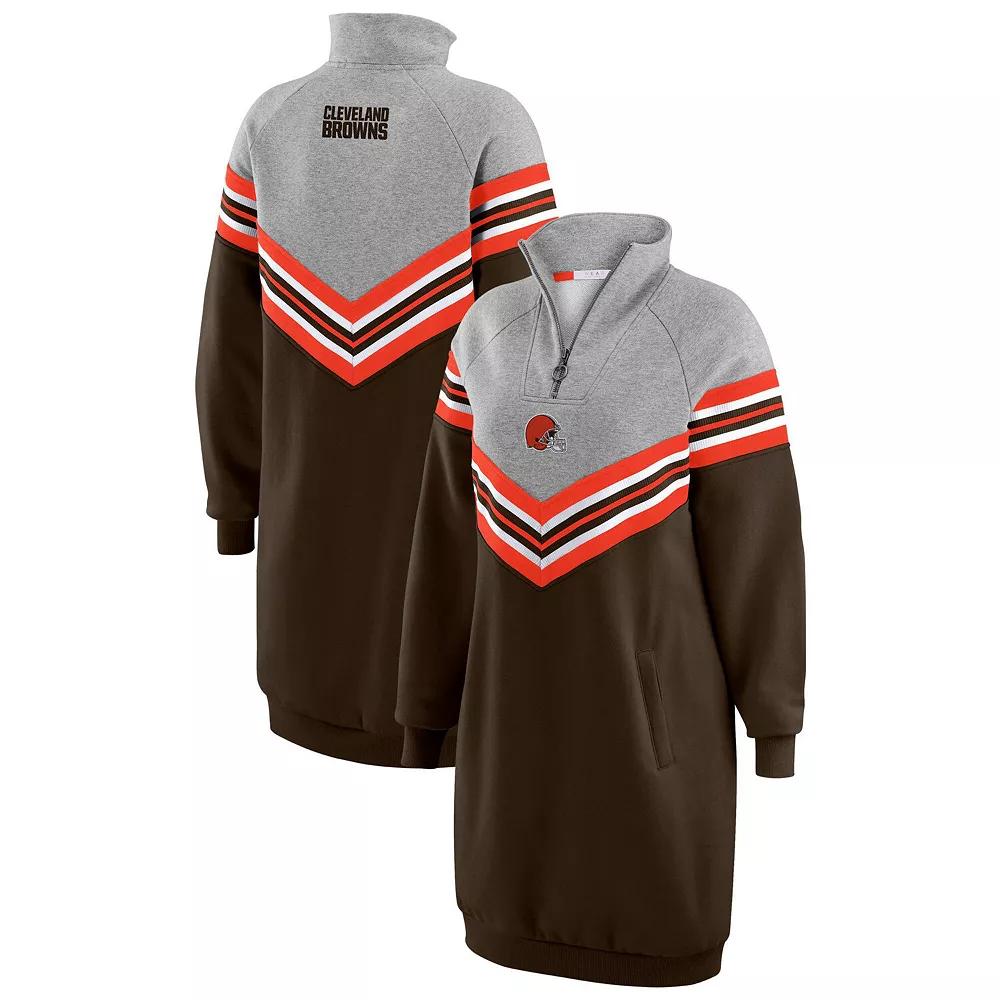 Bring a trendy twist to classic Cleveland Browns fashion with this WEAR by Erin Andrews Chevron Stripe Dress. Ultra-soft fabric delivers a luxuriously comfy feel, while the tailored fit allows for easy styling and freedom of movement, making it perfect for going to games, watch parties or out on the town. The Cleveland Browns details perfectly complement this gears stylish design.Bring a trendy twist to classic Cleveland Browns fashion with this WEAR by Erin Andrews Chevron Stripe Dress. Ultra-soft fabric delivers a luxuriously comfy feel, while the tailored fit allows for easy styling and freedom of movement, making it perfect for going to games, watch parties or out on the town. The Cleveland Browns details perfectly complement this gears stylish design.PRODUCT FEATURESMachine wash with garment inside out, tumble dry lowQuarter-zip closureRaglan sleeves for greater freedom of movement in the shoulders and armsMaterial: 60% Cotton/40% Polyester - Body; 94% Polyester/6% Spandex - ContrastMock neckOutseam on size S measures approx. 26Embroidered team wordmark at back neckFront pouch pocketBrushed French terry lining provides a soft feelBrand: WEAR by Erin AndrewsEmbroidered team logo at center frontOfficially licensedRib-knit insets with woven team color stripesImportedLong sleeve Gender: female. Age Group: adult.