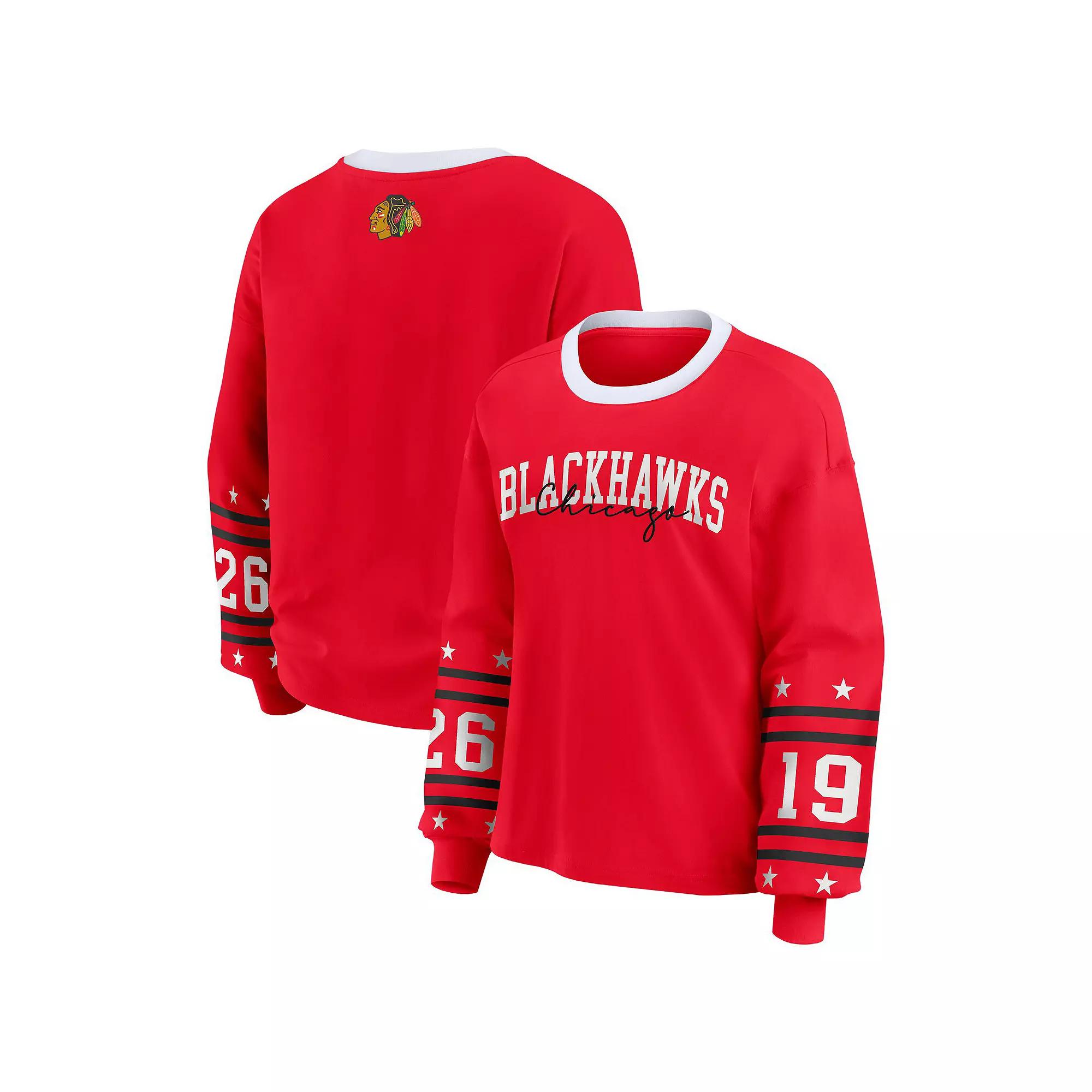 Show off your devotion to the Chicago Blackhawks with this Long-Sleeve Sport T-Shirt from WEAR by Erin Andrews. The relaxed fit and dropped shoulder seams provide a comfortable and laid-back feel. Embroidered city name under the screen print team wordmark showcases your Chicago Blackhawks pride with style and sophistication. Brand: WEAR by Erin Andrews. Imported. Machine wash with garment inside out, tumble dry low. Officially licensed. Crew neck provides a traditional look and is comfortable to wear all day. Tagless collar with interior taping for a more comfortable feel. Rib-knit collar and cuffs for a secure fit. Embroidered city name under screen print team wordmark. Dropped shoulders seams provide a relaxed fit. Screen print graphics on sleeves and at back neck. Long sleeve. Relaxed Fit: Shirt is loose and roomy across the chest, shoulders and body. Material: 60% Cotton/40% Polyester. Gender: female. Age Group: adult.