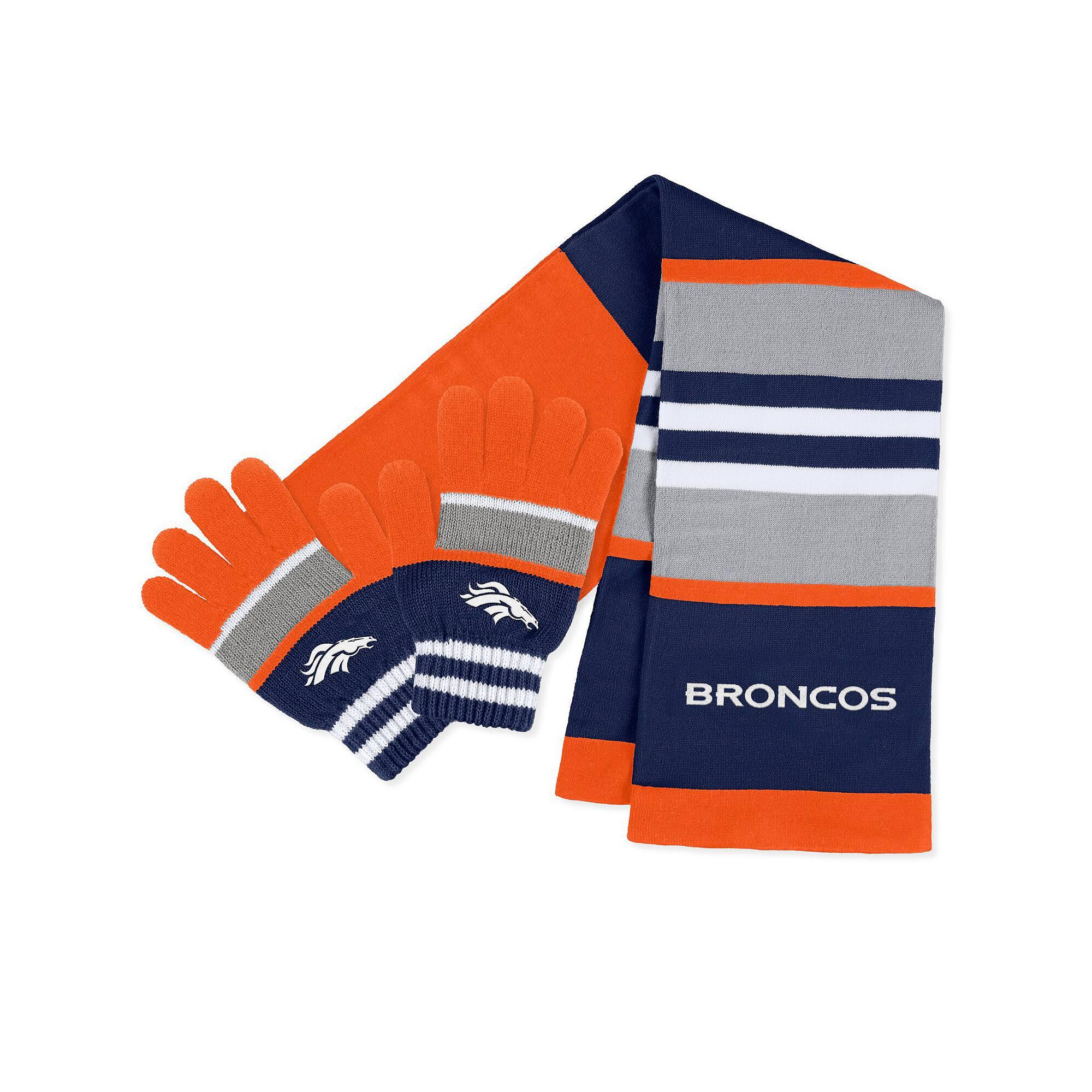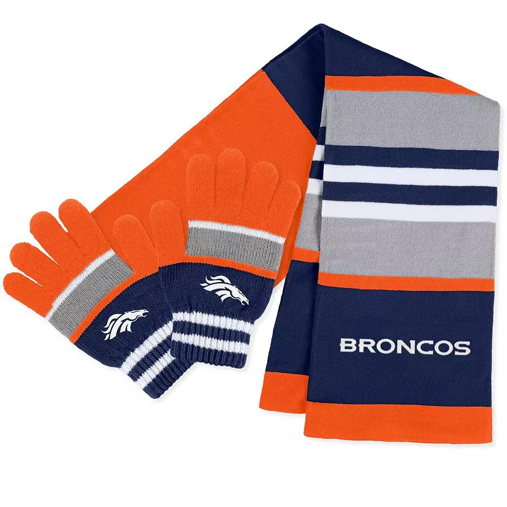 As temperatures descend, heat things up with this Denver Broncos scarf and gloves set from WEAR by Erin Andrews. This combo includes a cozy scarf and comfy gloves, both with spirited striped graphics to enhance your fandom in comfort. The scarfs decorative fringe ends and double-sided design make this a stylish ensemble you wont hesitate to reach for on colder Denver Broncos game days.