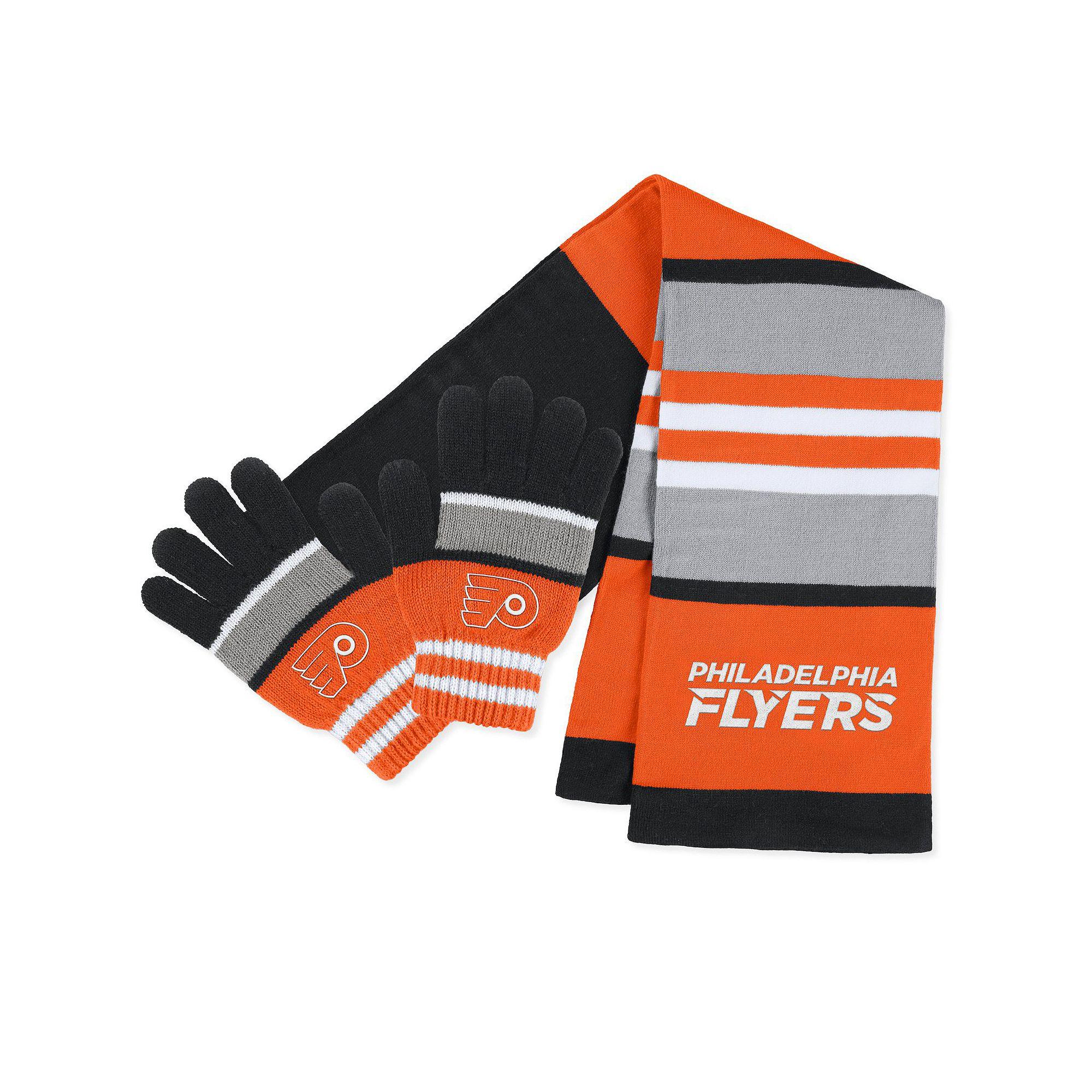 As temperatures descend, heat things up with this Philadelphia Flyers scarf and gloves set from WEAR by Erin Andrews. This combo includes a cozy scarf and comfy gloves, both with spirited striped graphics to enhance your fandom in comfort. The scarfs decorative fringe ends and double-sided design make this a stylish ensemble you wont hesitate to reach for on colder Philadelphia Flyers game days.
