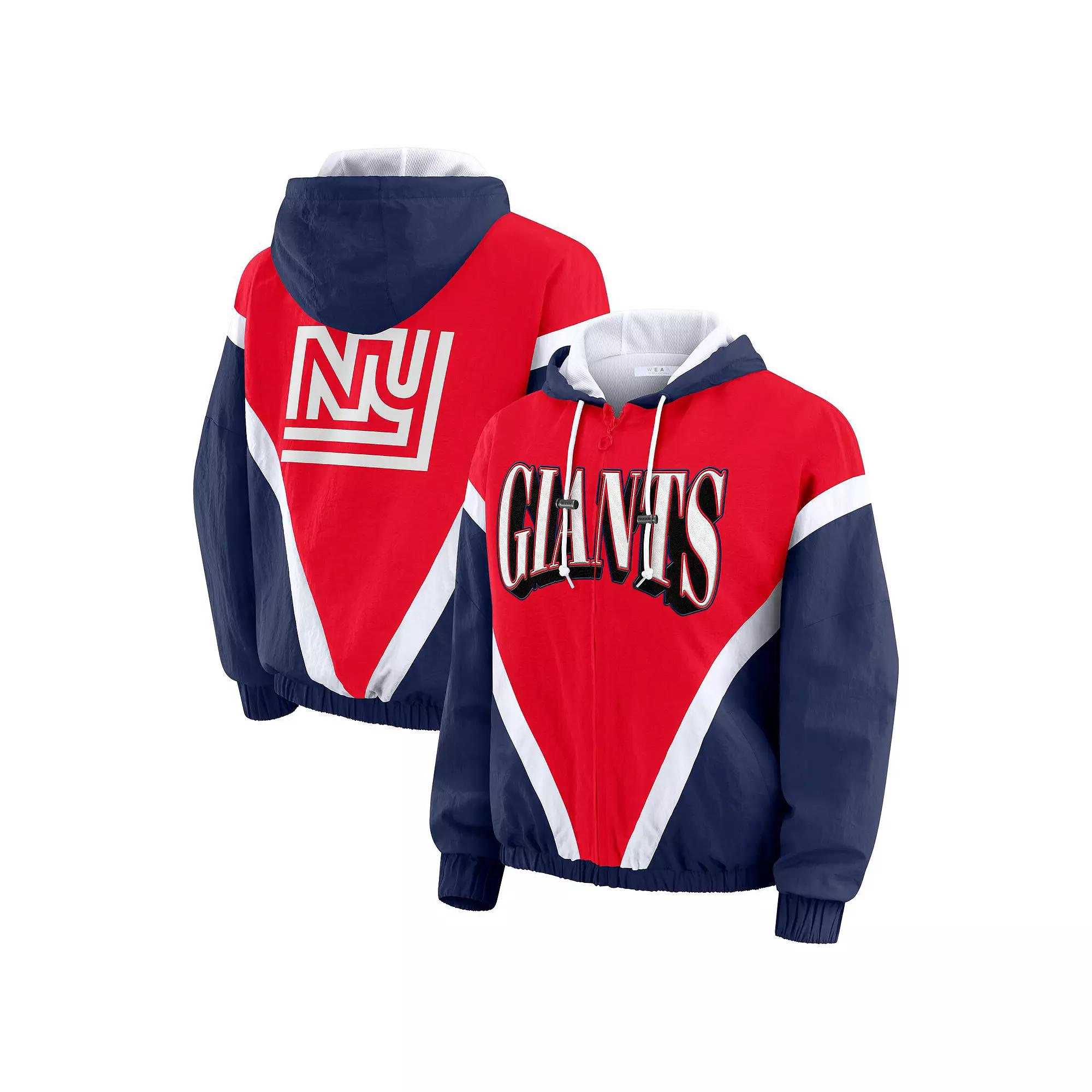 Show off your die-hard New York Giants devotion with this WEAR by Erin Andrews Retro Crinkle Full-Zip Hoodie Windbreaker. Lightweight and suitable for mild temperatures, this windbreaker includes a drawcord on the mesh-lined scuba hood, an elastic waistband and cuffs for a secure fit, and two front pockets for convenient storage options. Made of nylon, it features an embroidered team patch across the chest and printed team graphics on the back, making it the perfect way to showcase your team pride no matter the weather. Two front pockets provide convenient storage options. Brand: WEAR by Erin Andrews. Lightweight windbreaker suitable for mild temperatures. Officially licensed. Circular zipper pull to easily open and close. Protective zipper garage. Imported. Material: 100% Nylon - Shell; 100% Polyester - Lining. Machine wash with garment inside out, tumble dry low. Elastic waistband and cuffs for a fit that stays put. Full Zip. Long sleeve. Drawcord with toggles on mesh-lined hood for adjustable coverage from the elements. Retro embroidered team patch across the chest and throwback printed team logo on the back. Size: XS. Gender: female. Age Group: adult. Material: COTTON.