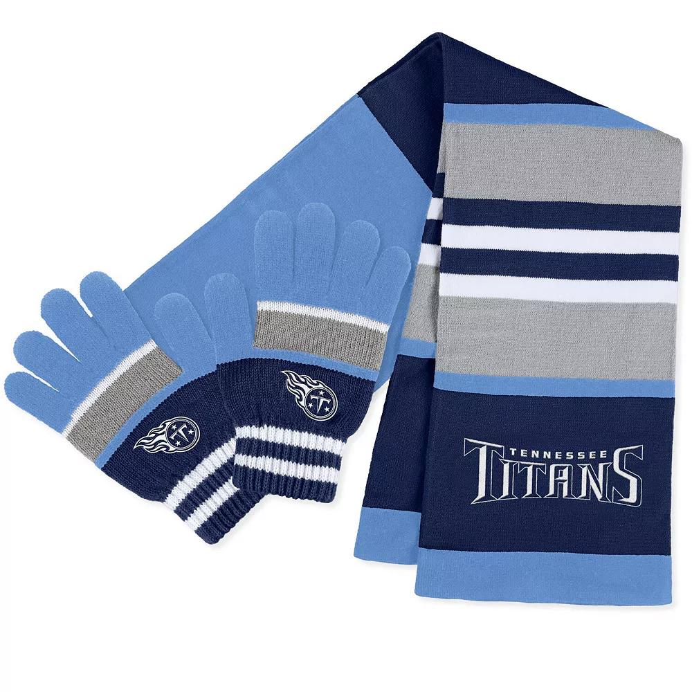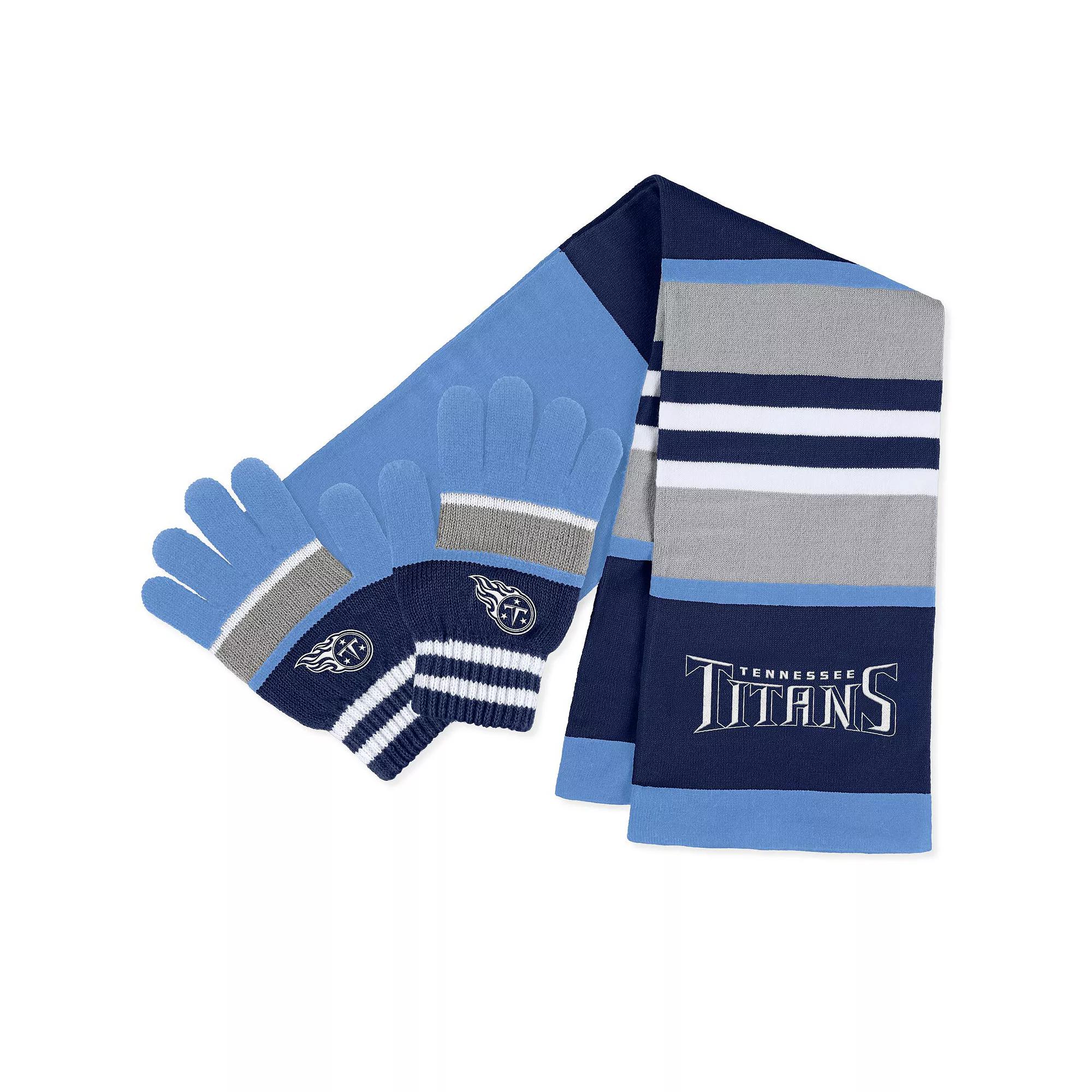 As temperatures descend, heat things up with this Tennessee Titans scarf and gloves set from WEAR by Erin Andrews. This combo includes a cozy scarf and comfy gloves, both with spirited striped graphics to enhance your fandom in comfort. The scarfs decorative fringe ends and double-sided design make this a stylish ensemble you wont hesitate to reach for on colder Tennessee Titans game days.As temperatures descend, heat things up with this Tennessee Titans scarf and gloves set from WEAR by Erin Andrews. This combo includes a cozy scarf and comfy gloves, both with spirited striped graphics to enhance your fandom in comfort. The scarfs decorative fringe ends and double-sided design make this a stylish ensemble you wont hesitate to reach for on colder Tennessee Titans game days.PRODUCT FEATURESOfficially licensedBrand: WEAR by Erin AndrewsSet includes knit gloves and scarfScarf measures approx. 64 x 7Woven fabric appliqueImportedScreen print graphicsSingle-sided design on scarfOne size fits mostKnit design Size: One Size. Color: Multicolor. Gender: female. Age Group: adult. Material: COTTON.