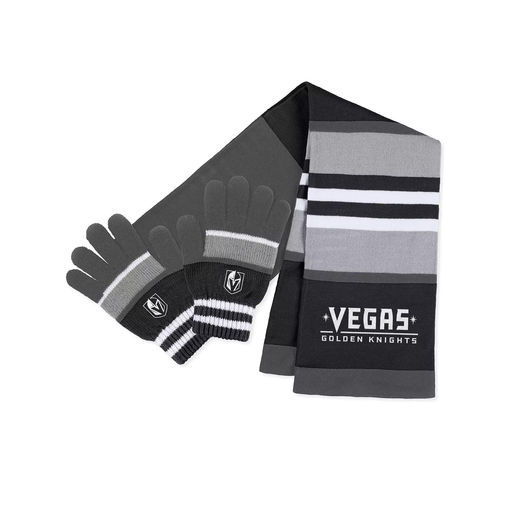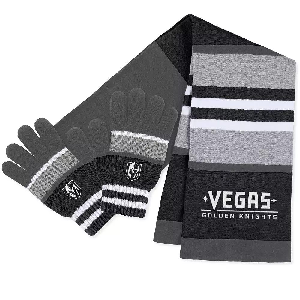 As temperatures descend, heat things up with this Vegas Golden Knights scarf and gloves set from Womens Wear by Erin Andrews. This combo includes a cozy scarf and comfy gloves, both with spirited striped graphics to enhance your fandom in comfort. The scarfs decorative fringe ends and double-sided design make this a stylish ensemble you wont hesitate to reach for on colder Vegas Golden Knights game days.