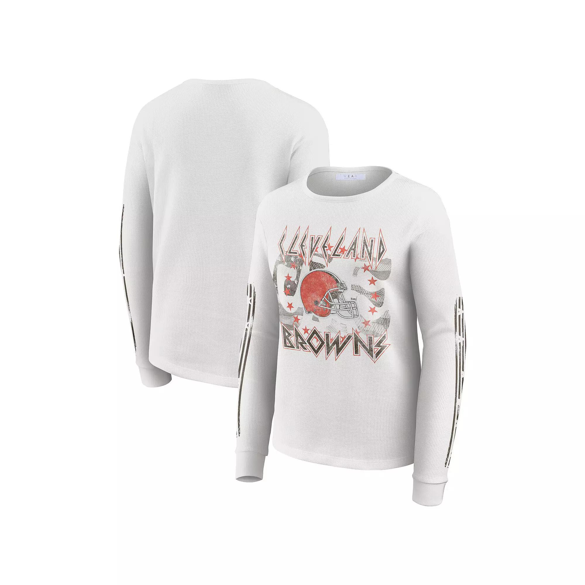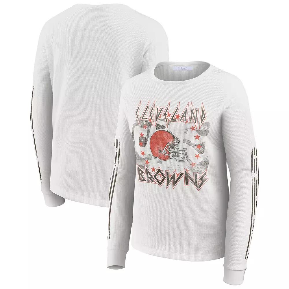Show off your Cleveland Browns fandom in style with this Graphic Waffle Long-Sleeve T-Shirt from WEAR by Erin Andrews. Featuring a classic fit that tapers slightly at the waist, this tee offers both a flattering silhouette and comfortable feel. The team name and logo graphic printed on the chest displays your favorite NFL franchise with pride, and with the stripes on the sleeves adding a touch of sporty flair, this is a must-have for any die-hard Cleveland Browns fan. Waffle knit fabric. Material: 60% Cotton/40% Polyester. Brand: WEAR by Erin Andrews. Distressed screen print team name and logo graphic on chest. Officially licensed. Rib knit cuffs for a snug fit and easy mobility. Long sleeve. Classic Fit: Not too loose or tight across the chest and shoulders but tapers at the waist for a flattering silhouette. Imported. Machine wash with garment inside out, tumble dry low. Stripe design printed on sleeves. Crew neck. Color: White. Gender: female. Age Group: adult.