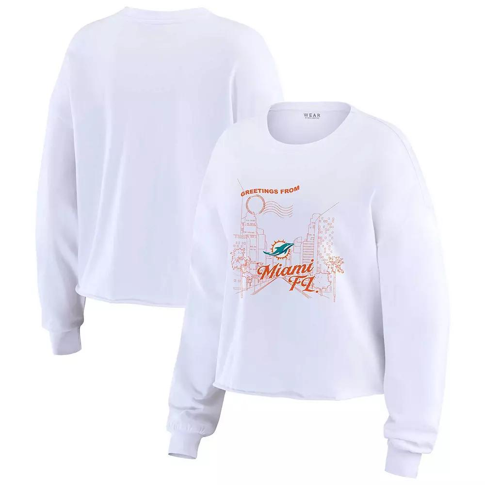 Channel vintage vibes and modern Miami Dolphins spirit with the WEAR by Erin Andrews Postcard Cropped Long Sleeve Top. This cropped long sleeve top features a trendy dropped shoulder design and rib-knit accents for a casual, yet put-together look. Its Greetings From graphic featuring the Miami Dolphins logo adds a touch of vintage charm to your game day style.Channel vintage vibes and modern Miami Dolphins spirit with the WEAR by Erin Andrews Postcard Cropped Long Sleeve Top. This cropped long sleeve top features a trendy dropped shoulder design and rib-knit accents for a casual, yet put-together look. Its Greetings From graphic featuring the Miami Dolphins logo adds a touch of vintage charm to your game day style.PRODUCT FEATURESDropped shouldersLong sleeveOfficially licensedMaterial: 100% CottonImportedTeam logo and Greetings From design printed on frontBrand: WEAR by Erin AndrewsTrendy dropped shoulders for a casual look and relaxed fitMachine wash, tumble dry lowRib-knit crew neck and cuffsCropped hem adds a stylish and modern aesthetic Color: White. Gender: female. Age Group: adult.