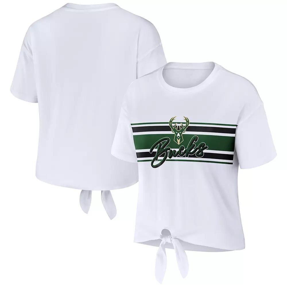 Turn the classic tee into contemporary style with this Milwaukee Bucks Tie-Front T-shirt from WEAR by Erin Andrews. It features printed team graphics accentuated by the clean look and knotted tie detail. Jersey fabric gives this chic Milwaukee Bucks shirt a soft, comfortable feel.Turn the classic tee into contemporary style with this Milwaukee Bucks Tie-Front T-shirt from WEAR by Erin Andrews. It features printed team graphics accentuated by the clean look and knotted tie detail. Jersey fabric gives this chic Milwaukee Bucks shirt a soft, comfortable feel.PRODUCT FEATURESImportedDropped shouldersScreen print graphicsShort sleeveOfficially licensedMachine wash with garment inside out, tumble dry lowMaterial: 100% CottonRounded hemCrew neckBrand: WEAR by Erin AndrewsKnotted tie closure at waist Color: White. Gender: female. Age Group: adult.