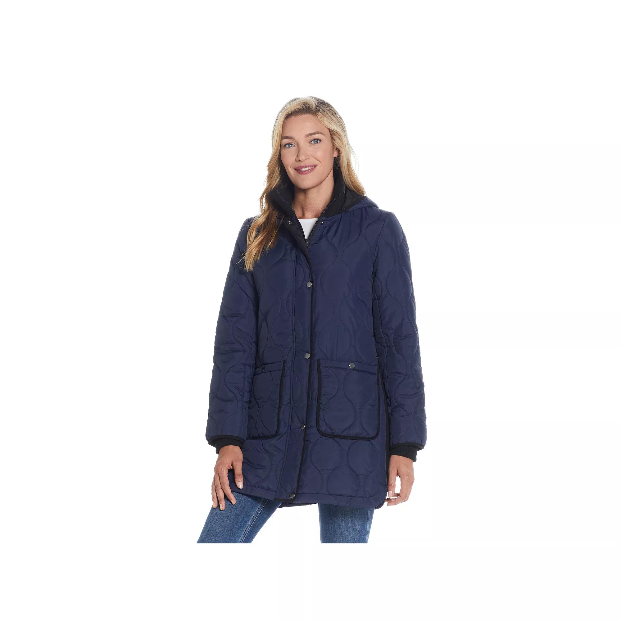 Stay cozy all winter long with this womens quilted walker jacket from Weathercast. Stay cozy all winter long with this womens quilted walker jacket from Weathercast.Finding the perfect fit and size for womens clothing requires basic measurements of your chest, waist, hips and inseam. Use this guide to learn more about sizing and everything Kohls has to offer in womens fashion. Windproof & Water-resistant shell Quilted design Attached hood Zipper front Long sleeves with inner storm cuffs Ribbed trim 2 pocketsFIT & SIZING Designed to hit just below the waist Inner drawstring waistband with cinched back Knit side panels for a custom fit MidweightFABRIC & CARE Polyester Machine wash - Delicate Imported Size: Small. Color: Navy. Gender: female. Age Group: adult.