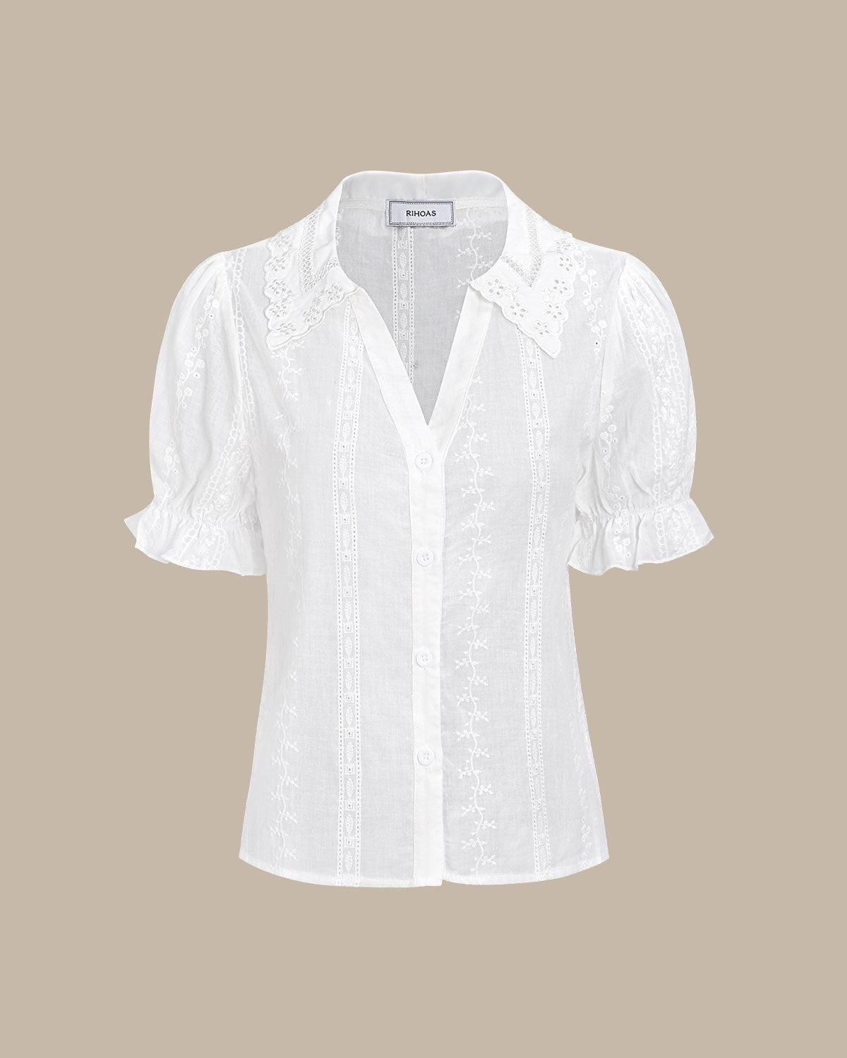 Fabric:This White Blouse is made of Cotton. Cotton fabric features humidity balance, durability, and eco-friendly nature, feeling soft but not stiff when touching the skin. Description:Crafted from soft, breathable cotton, this blouse features intricate lace embroidery that enhances its delicate aesthetic. The crisp white color and classic collared design offer a timeless appeal, making it versatile for both casual and formal occasions. Details:- Occasion: Daily- Top Length: Hip- Fabric Stretch: No Stretch- Embellishment: Embroidery, Button, Lace- Fabric: Cotton 100.0%- Material: Cotton