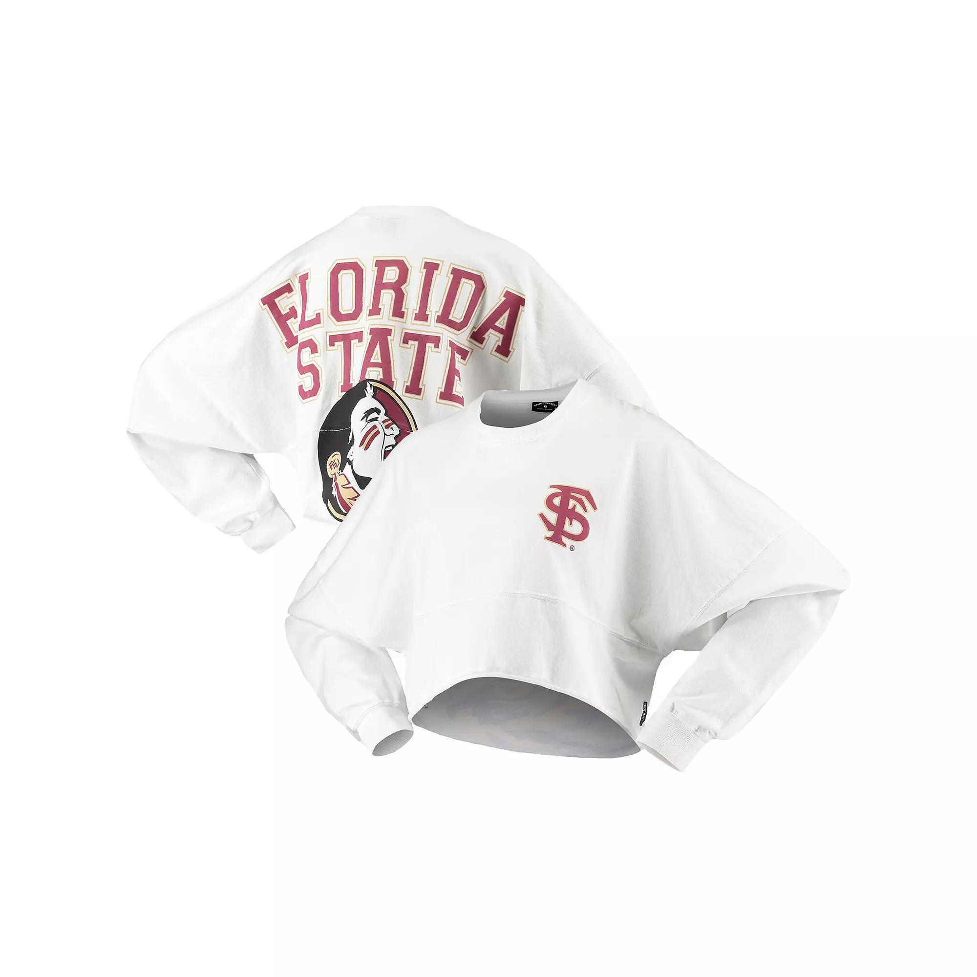 Whether youre a current student, alumni or just a superfan, every member of the Florida State Seminoles franchise needs a solid collection of gear. This season, spruce up your look with this chic Raw Hem Cropped Spirit Jersey T-shirt! The fierce Florida State Seminoles graphics and super-soft blend make this fun top a must-have addition to your closet!Whether youre a current student, alumni or just a superfan, every member of the Florida State Seminoles franchise needs a solid collection of gear. This season, spruce up your look with this chic Raw Hem Cropped Spirit Jersey T-shirt! The fierce Florida State Seminoles graphics and super-soft blend make this fun top a must-have addition to your closet!Brand: Spirit JerseyCrew neckLong sleeveMachine wash, tumble dry lowMaterial: 100% CottonOfficially licensedRaw hemRib-knit collar and cuffsScreen print graphics Color: FSU WHITE. Gender: female. Age Group: adult.