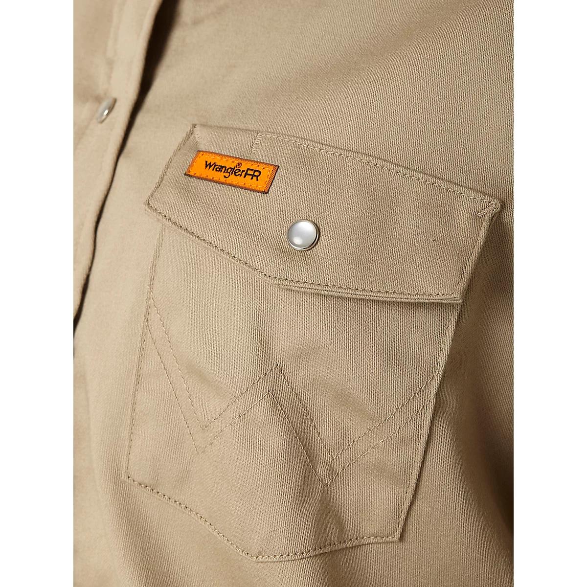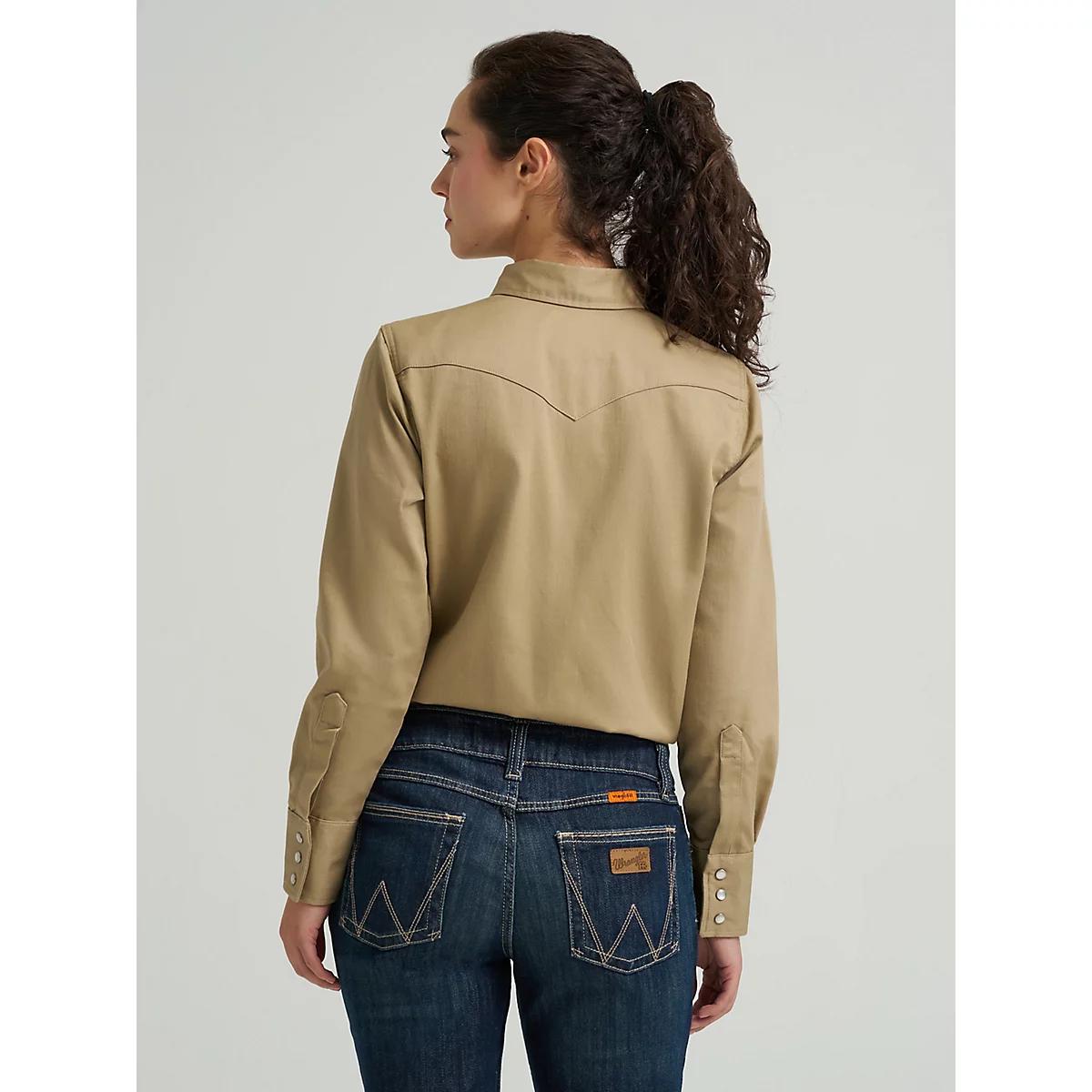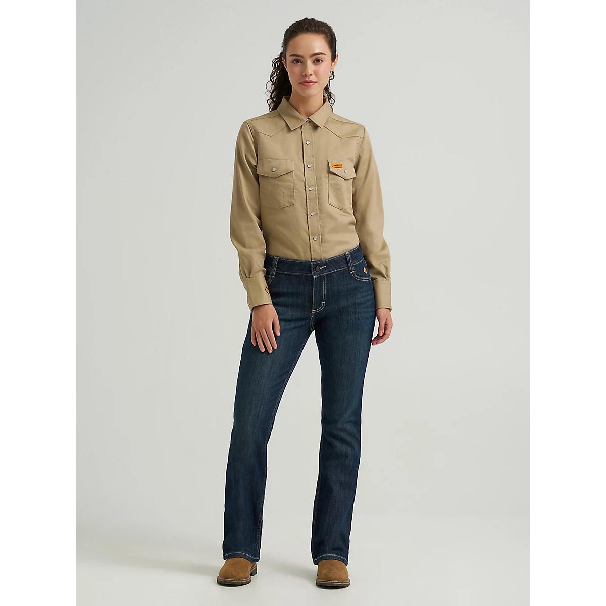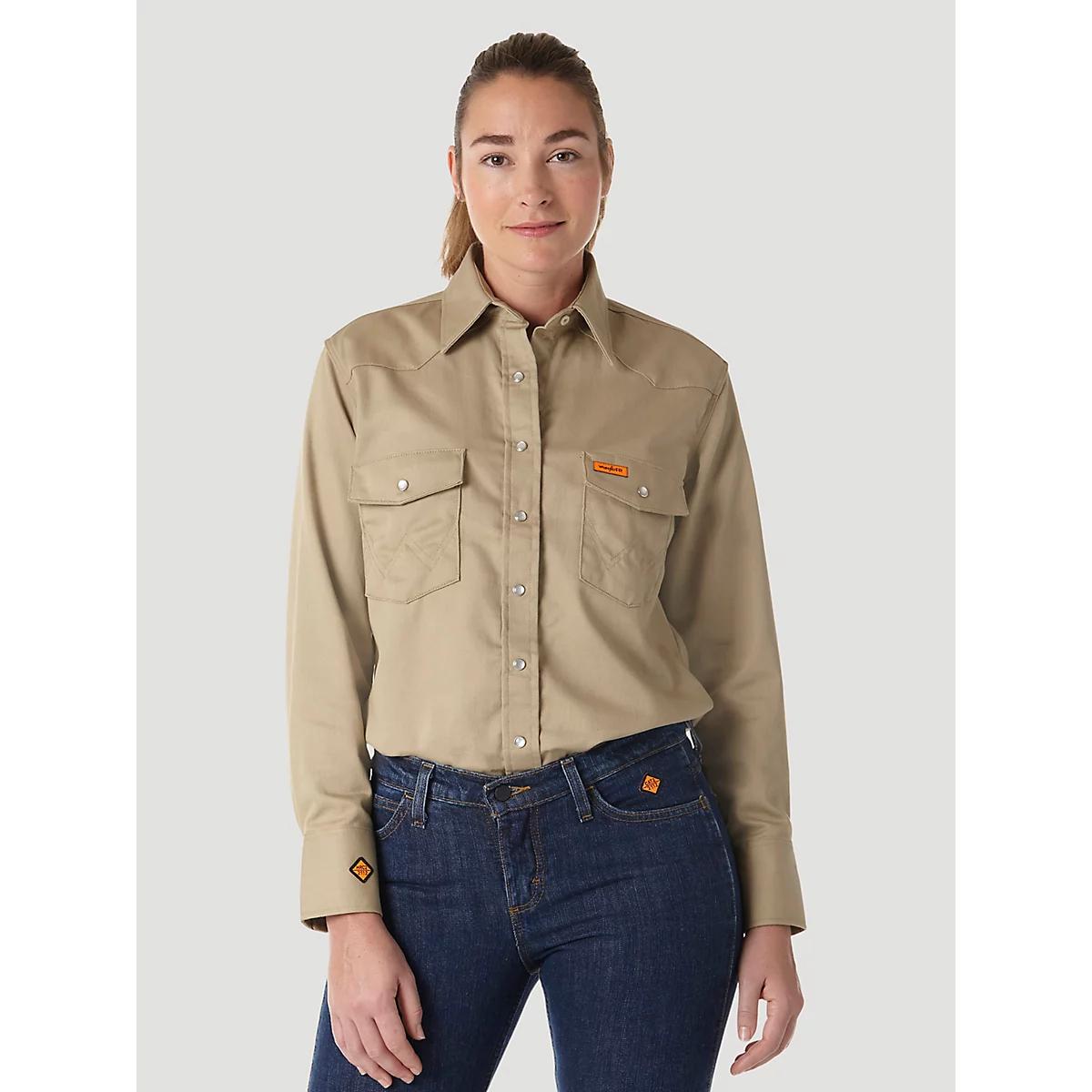 WHERE SAFETY MEETS WESTERN-INSPIRED STYLEStay safe and focused on the task at hand in the Wrangler® FR Women's Flame-Resistant Long Sleeve Solid Work Shirt. Designed to protect you from electric arc flash and flash fire exposure, this Western-inspired snap shirt is crafted from a durable cotton blend with stretch for comfort. It comes with all the details you know and love, including two spade front pockets with flaps, a pencil slot, Western front and back yokes, and the signature “W” stitching. Plus, you’ll have an orange safety ID for better visibility. ATPV 8.9 CAL/CM2 Certifications: Meets CAT2, NFPA 70e/NFPA 2112, ASTM 1506, and OSHA Rule 1910.269 Standards