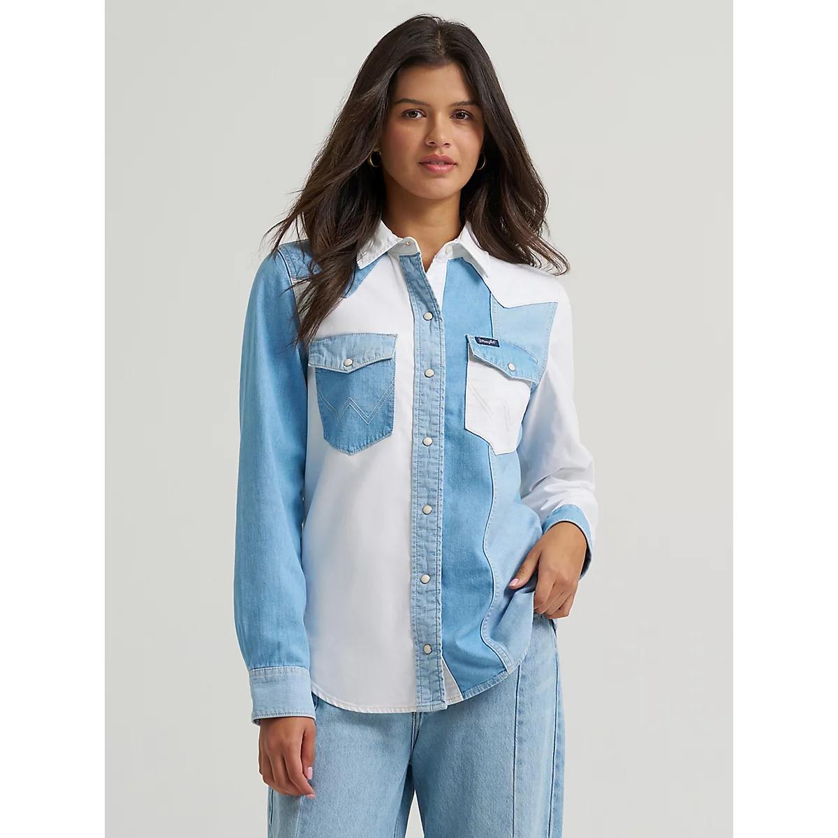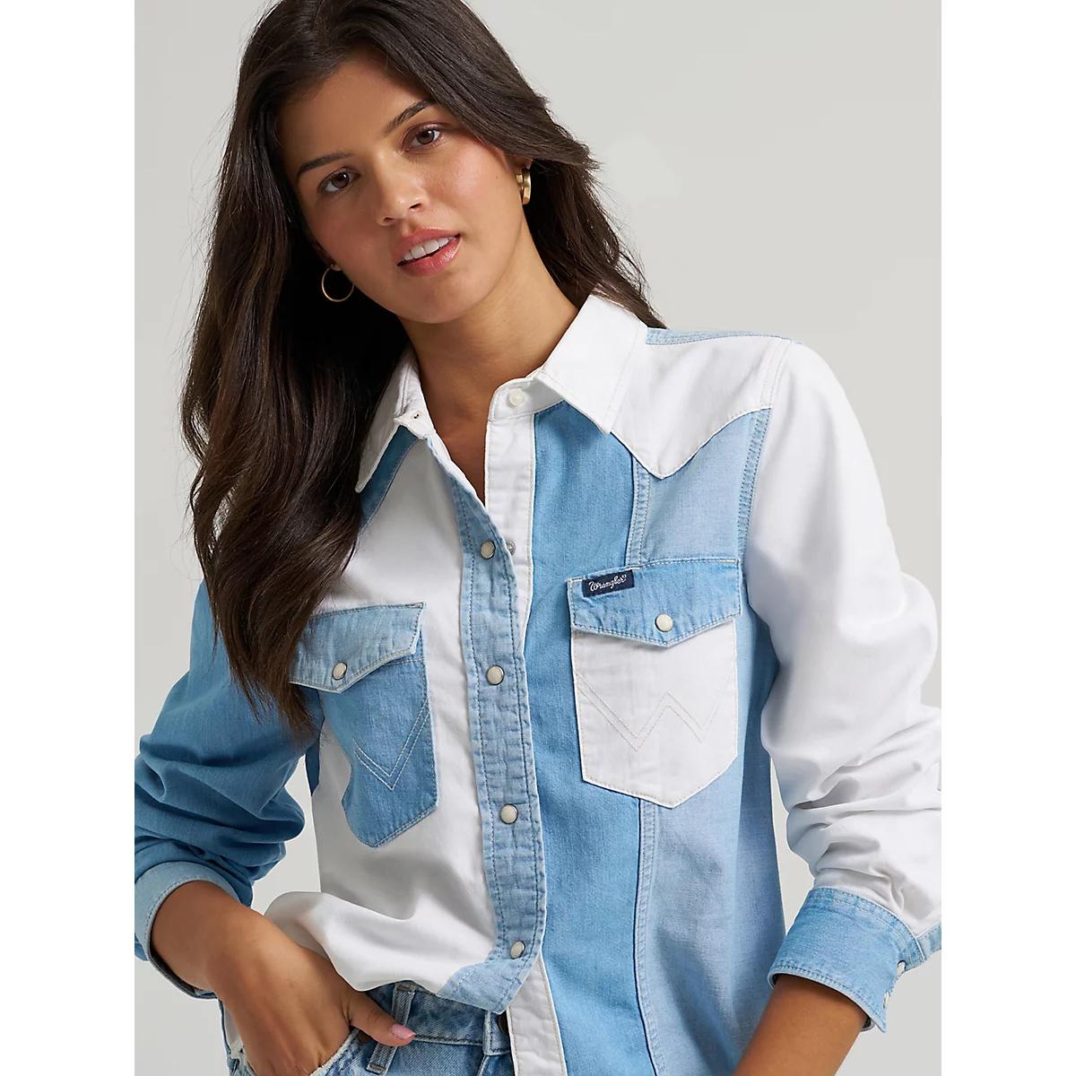 Shop the Women's Wrangler Pieced Denim Vintage Fit Snap Shirt on Wrangler.com, the official website for Wrangler TOPS and all your favorite Wrangler women's apparel.