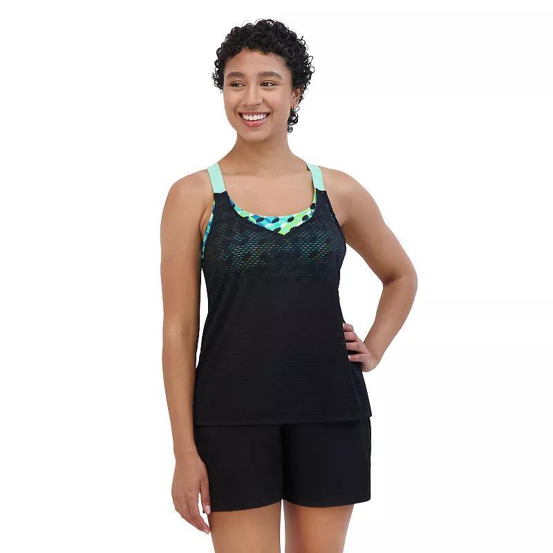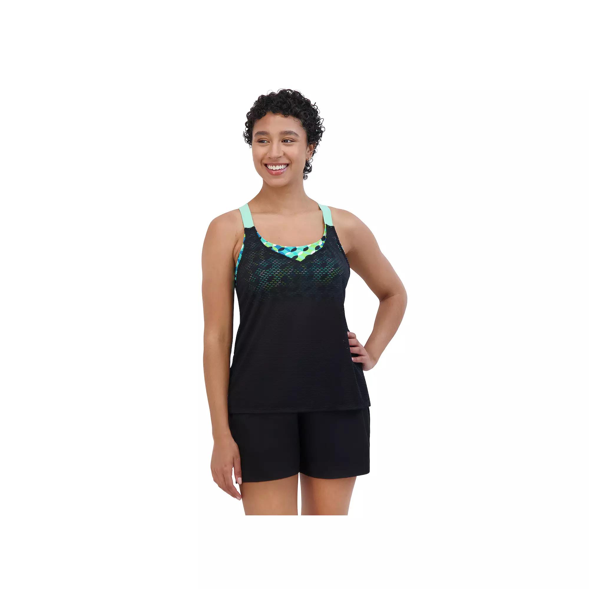 This 2-in-1 tankini with an inner full coverage sport bra includes sewn-in soft cups, soft wide shoulder straps for support and an action back for movement.Click on this WOMEN'S GUIDE to find the perfect fit and more!This 2-in-1 tankini with an inner full coverage sport bra includes sewn-in soft cups, soft wide shoulder straps for support and an action back for movement.Click on this WOMEN'S GUIDE to find the perfect fit and more!FEATURES Scoopneck Sleeveless Soft bra cups No closure - pullover styling Partially lined UPF 30+ sun protectionFIT & SIZING Moderate coverage WirelessFABRIC & CARE Polyester, spandex Lining: 100% recycled polyester Hand wash ImportedRESPONSIBLE Contains recycled polyester Size: Large. Color: Matcha. Gender: female. Age Group: adult.