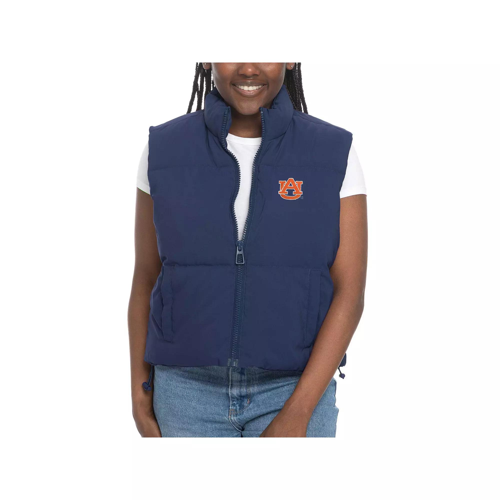 Stay warm while repping your Auburn Tigers with this ZooZatz Cropped Puffer Full-Zip Vest. This stylish vest features a flattering cropped hem and a convenient mock collar for added warmth. With two front pockets and a full-zip closure, this Auburn Tigers vest is perfect for layering over your favorite game day outfit. Cropped hem adds a stylish and modern aesthetic. Interior locker loop at back neck. Full Zip. Sleeveless. Two front pockets for warming hands or holding small items. Brand: ZooZatz. Officially licensed. Imported. Material: 100% Polyester. Embroidered school logo on left chest. Mock collar protects your neck from wind. Midweight vest suitable for moderate temperatures. Machine wash, tumble dry low. Bottom hem with drawcord and toggle closures to help protect from cooler temperatures. Color: Navy. Gender: female. Age Group: adult. Material: COTTON.