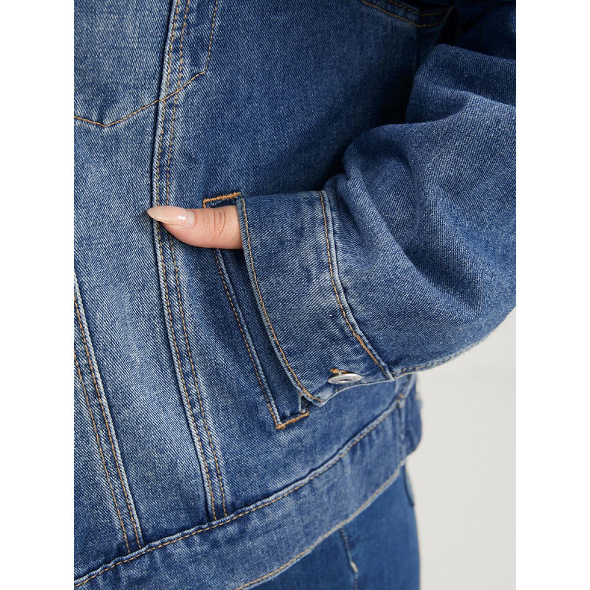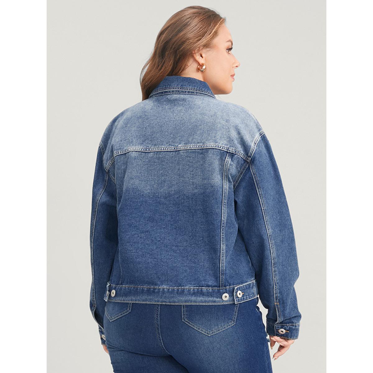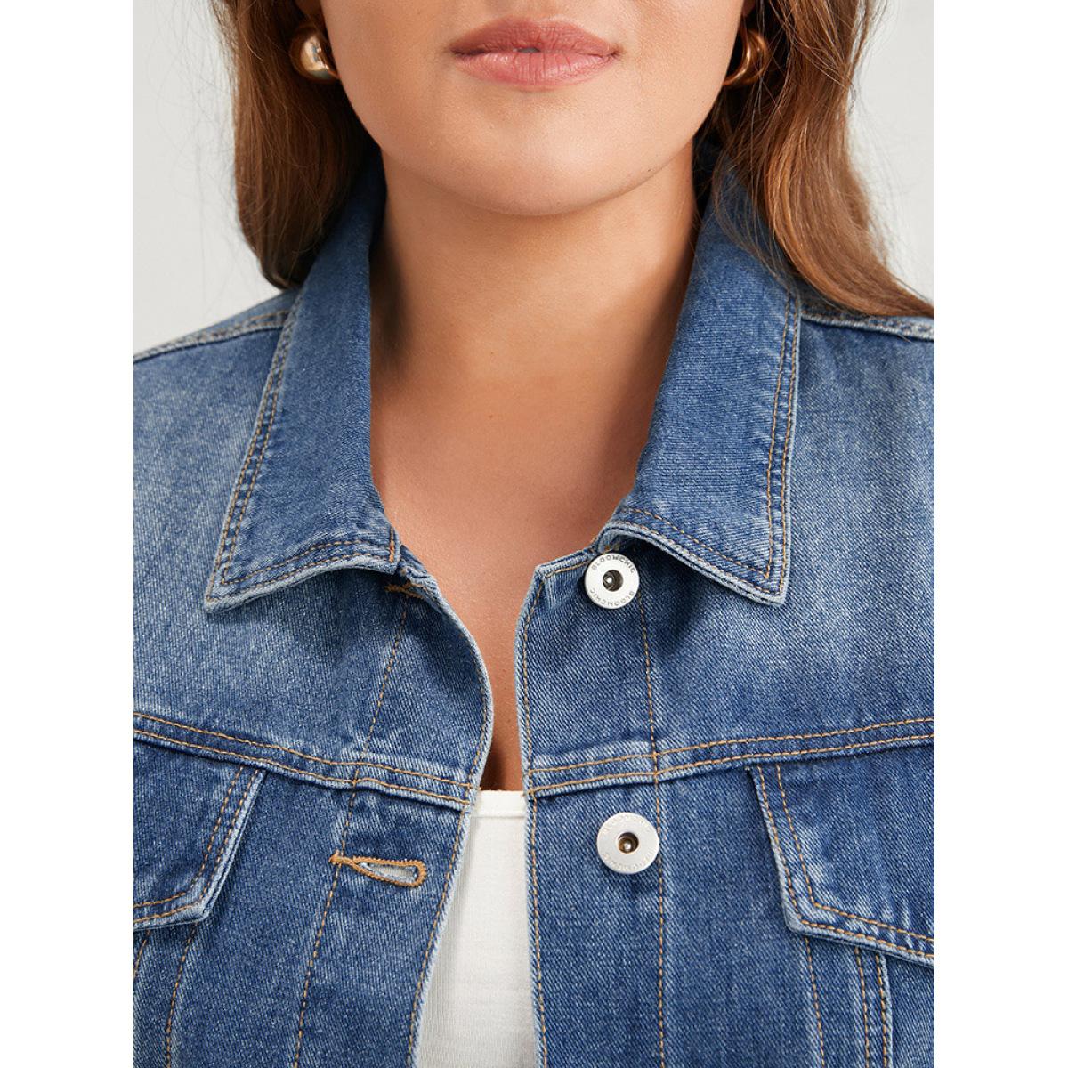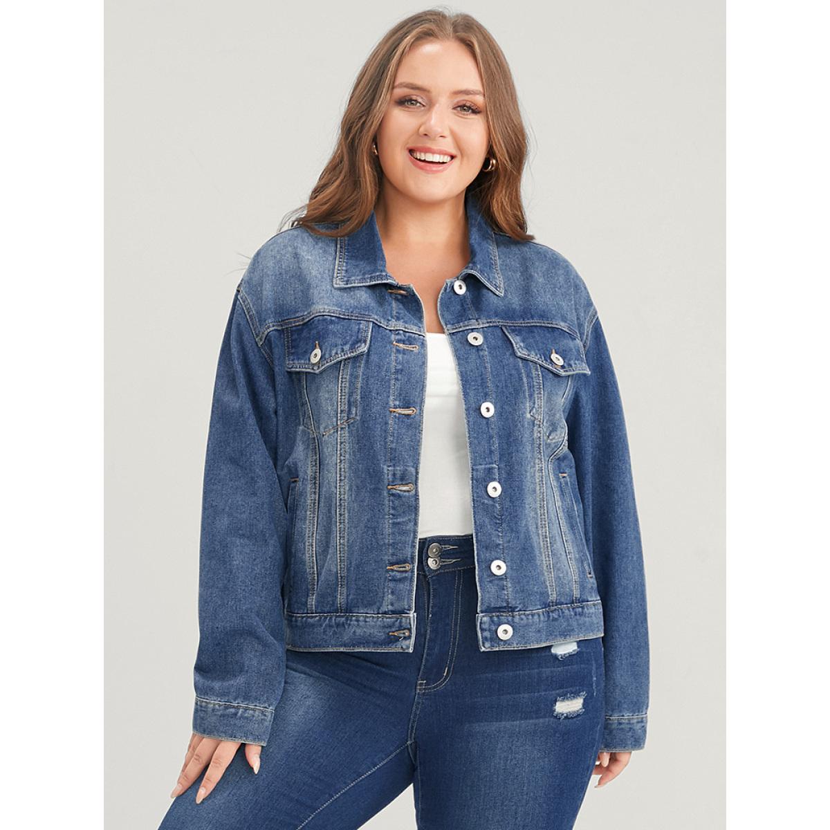 Women Solid Flap Pocket Button Front Dark Wash Denim Jacket Cerulean Plus Size Plain Dailywear Pocket Casual Denim Jackets BloomChic 18-20/2X