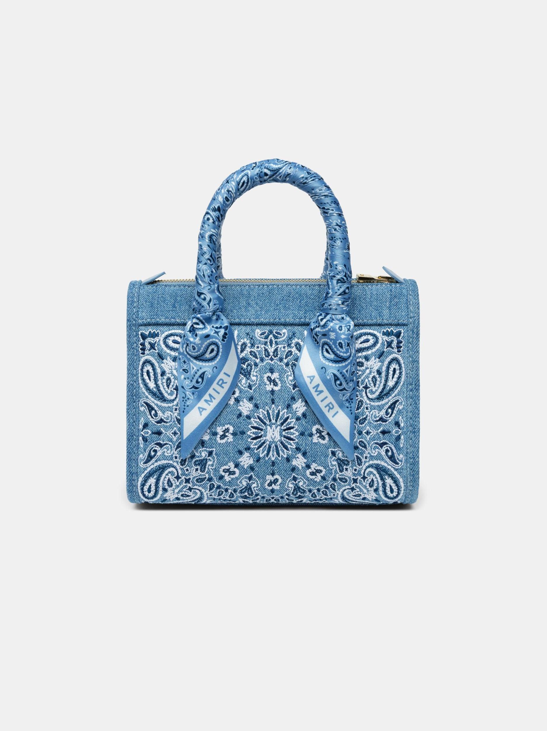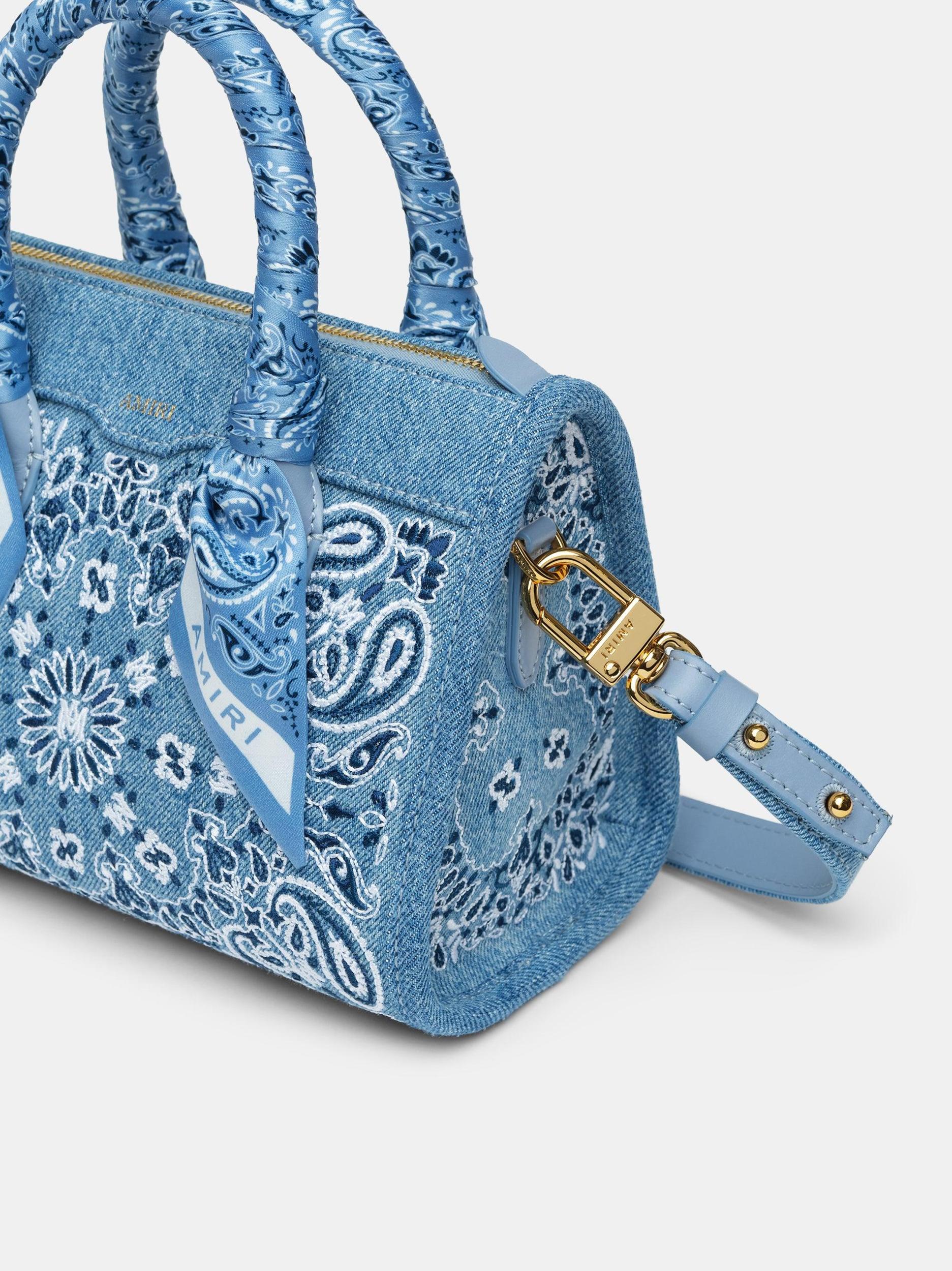 Pairing new tactility with familiar form, the Micro Triangle Bag is updated for Pre-Spring 2025 in bandana denim. The Denim Bandana Micro Triangle is embroidered with bandana motifs and features top handles with tied scarf accents and a detachable shoulder strap. PRE-SPRING 2025 COLLECTION MADE IN ITALY COTTON EXTERIOR