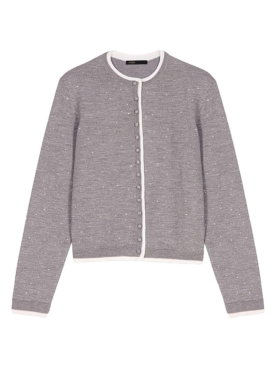 Maje draws inspiration from a new energy by combining modernity and elegance, with pieces that play with urban codes while remaining timeless.This 100% wool knit cardigan embellished with rhinestones stands out as a key piece of the collection. Its round neck and long sleeves offer comfort and softness, while the contrasting 2-in-1 effect hem adds a sophisticated touch. This piece, both chic and casual, ideal for everyday wear, features a covered button fastening and can be worn as a complete lo
