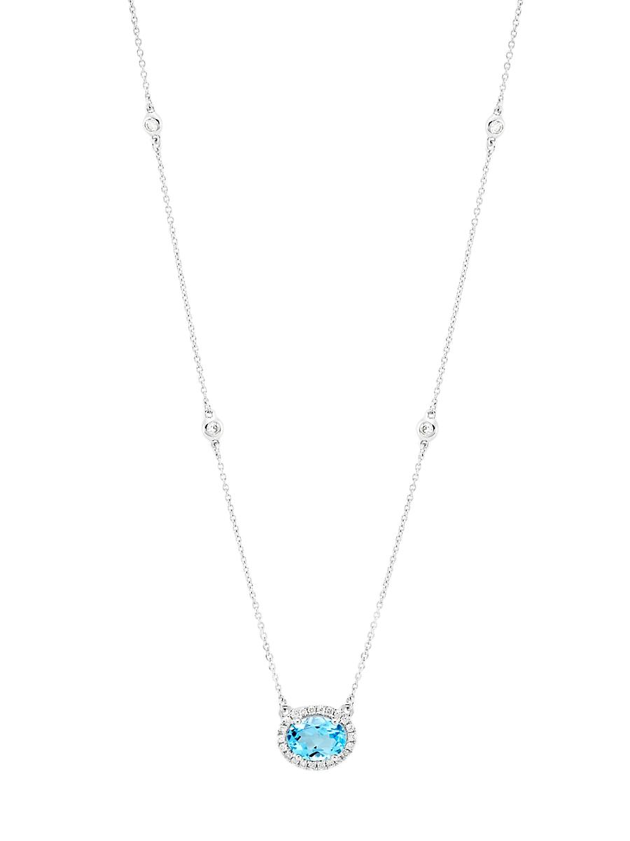 ONLY AT SAKS. Crafted of 14K white gold, Saks Fifth Avenue Collections necklace features stunning east-west oval blue topaz pendant bordered by shimmering pav diamonds. Petite bezel-set diamonds at the chain beautifully complement this focal embellishment. Diamonds, 0.27 tcw Diamond color grade: H-I Diamond clarity grade: SI2-I1 Blue topaz 14K white gold Lobster clasp Made in USA SIZE Chain: about 18L. Fashion Jewelry - Sfa Jewelry C > Saks Fifth Avenue Collection > Saks Fifth Avenue > Barneys. Saks Fifth Avenue Collection. Color: White Gold.