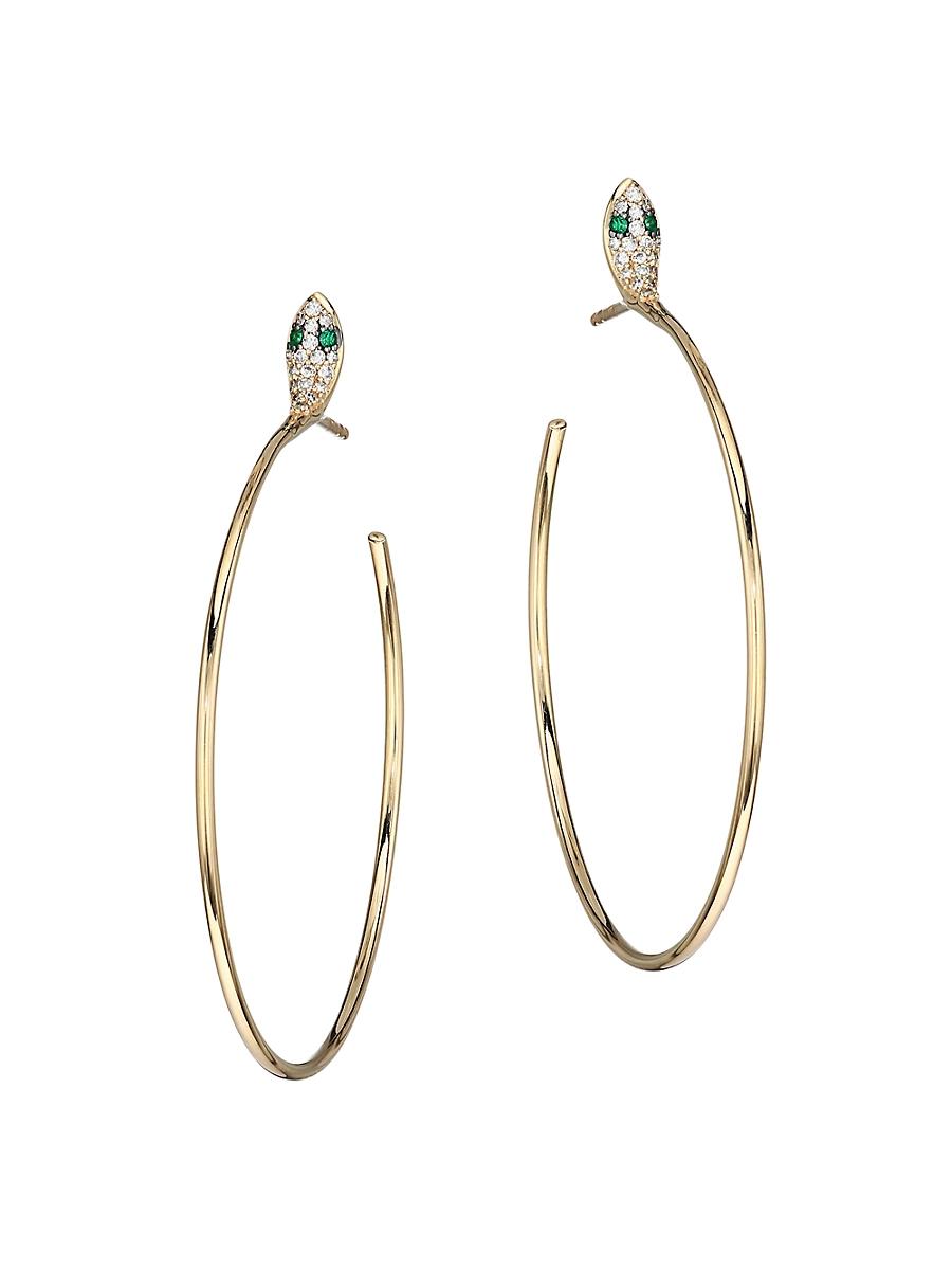 Gleaming yellow gold hoops embellished with a snake motif paved in diamonds with emerald eyes. Diamonds. 0.12 tcw Diamond color: H/I Diamond clarity: SI-1 14K yellow gold Solid fill Post back Imported SIZE Drop, about 1.5. Fashion Jewelry - Semi Prec Coll C > Nina Gilin > Saks Fifth Avenue > Barneys. Nina Gilin. Color: Gold.