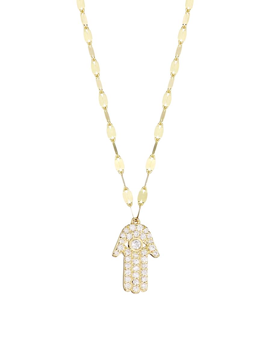 Made of 14K yellow gold, this elegant necklace sparkles with a white-diamond-encrusted hamsa pendant. Diamonds, 0.176 tcw 14K yellow gold Lobster clasp Imported SIZE Length, about 18 with extender Pendant drop, about 10mm Pendant width, about 8mm. Fashion Jewelry - Fashion Designer > Lana > Saks Fifth Avenue > Barneys. Lana. Color: Yellow Gold.