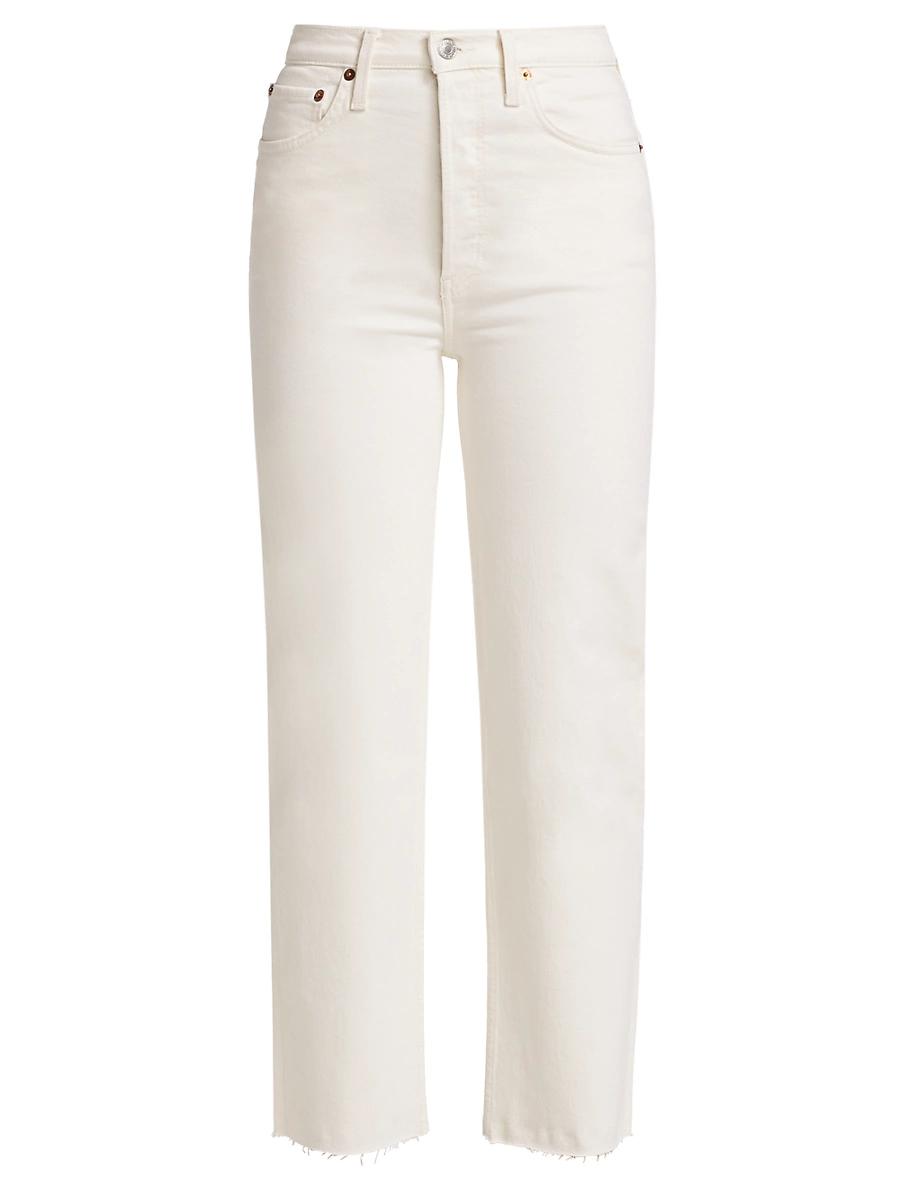 Straight jeans with a 70s-inspired look, flaunting a tonal vertical striped design. Five-pocket styling Button fly with button Cotton/elastane Machine wash Made in USA SIZE & FIT Rise, about 11 Inseam, about 27 Leg opening, about 14 Model measurements: 510 tall Model is wearing a US size 4 For basic alterations and hemming, book an appointment online at your local Saks Fifth Avenue location. Contemporary Sportswear - Denim And Bottoms > Re/done > Saks Fifth Avenue > Barneys. Re/done. Color: Vintage White. Size: 26.