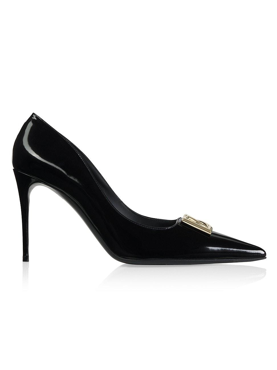 Crafted of sleek patent leather, these DOLCE & GABBANA posts are topped with a goldtone DG logo plaque. Point toe Slips on Leather upper Leather sole Made in Italy SIZE Stiletto heel, about 3.5 (90mm) ABOUT THE BRAND Mediterranean-inspired prints and luxe silhouettes are mainstays of the Italian label, launched in 1985 by Domenico Dolce and Stefano Gabbana. The eye-catching line includes a lineup of sleek clothing and maximalist shoes and handbags. Womens Shoes - D & G Womens Shoes > Dolce & gabbana > Saks Fifth Avenue > Barneys. DOLCE & GABBANA. Color: Black. Size: 9.5.