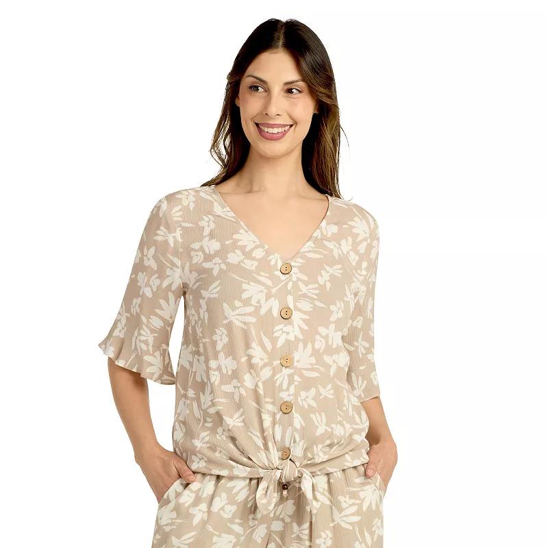 Youll love the fit and feel of this womens AB Studio elbow sleeve button-front tie hem top. Click on this WOMENS GUIDE to find the perfect fit and more!Youll love the fit and feel of this womens AB Studio elbow sleeve button-front tie hem top. Click on this WOMENS GUIDE to find the perfect fit and more!FEATURES V-neck Elbow sleeves Button front High-low hem Soft crinkle woven constructionFIT & SIZING Loose fit 27-in. length from shoulder to hemFABRIC & CARE Rayon Machine wash delicate and line dry Imported Size: X Small. Color: Sand Grnd Floral. Gender: female. Age Group: adult.