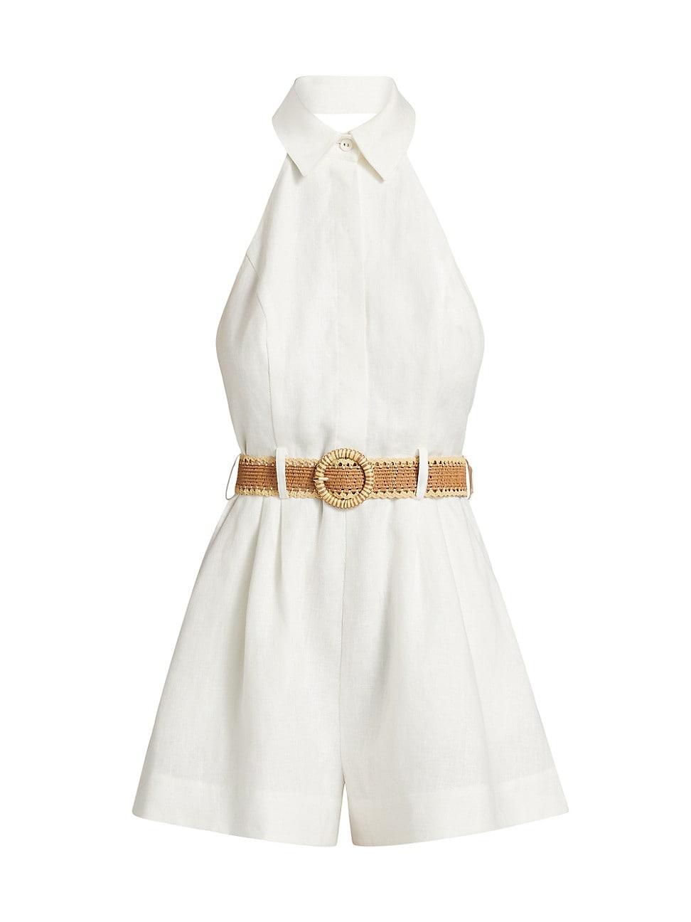 Crafted of lightweight linen, Zimmermanns Acacia romper showcases a halter-style spread collar, contrasting belt, and side slash pockets. Spread collar, halterneck Sleeveless Adjustable belt, belt loops Side slash pockets Concealed button-front closure Concealed back zip closure 100% linen Lining: 100% cotton Dry clean Imported SIZE & FIT This style is constructed in a woven, no-stretch fabric for a tailored fit About 33 from shoulder to hem Waist: about 28 Inseam: about 2.5 Leg opening: about 36 Model measurements: 510 tall Model is wearing a US size 4 ABOUT THE BRAND Australian founders and sister-duo Nicky and Simone Zimmermann design with a signature feminine aesthetic, each piece rife with tiers of fabric, rich embroidery and splashy prints. From ruffled bikinis and beachwear to luxe, intricately patterned maxi (and mini) dresses, everything is overtly romantic in the most elevated, effortless way. Contemporary Sportswear - Zimmermann > Zimmermann > Saks Fifth Avenue > Barneys. Zimmermann. Color: Ivory. Size: 10.
