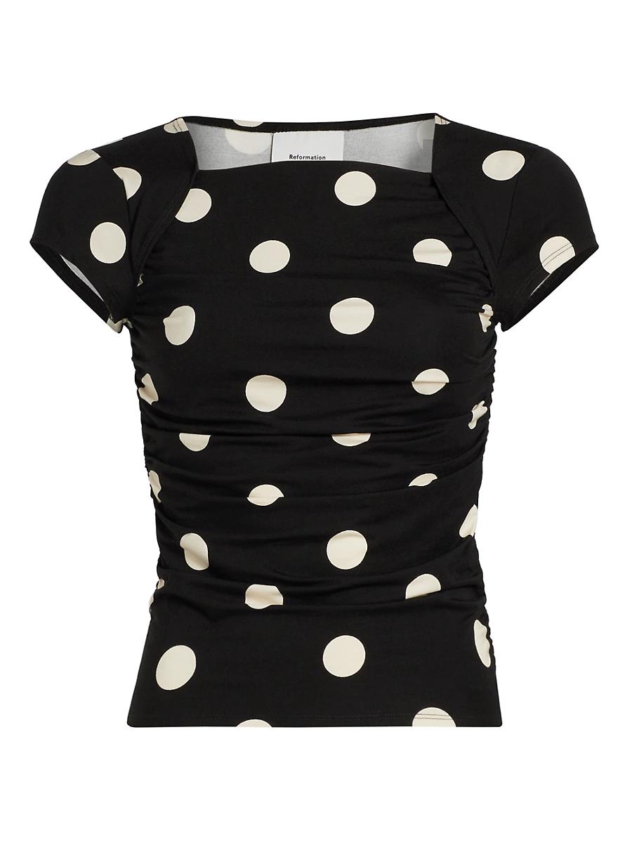 Reformations Addison short-sleeve top is knit from polka dot stretch fabric and styled with ruching. Square neck Short sleeves Pulls over 88% lyocell/12% spandex Machine wash Made in USA SIZE & FIT About 20.25 from shoulder to hem Model measurements: 510 tall Model is wearing a US size Small. Contemporary Sportswear - Contemporary Collections > Reformation > Saks Fifth Avenue > Barneys. Reformation. Color: Moon Dot. Size: Large.