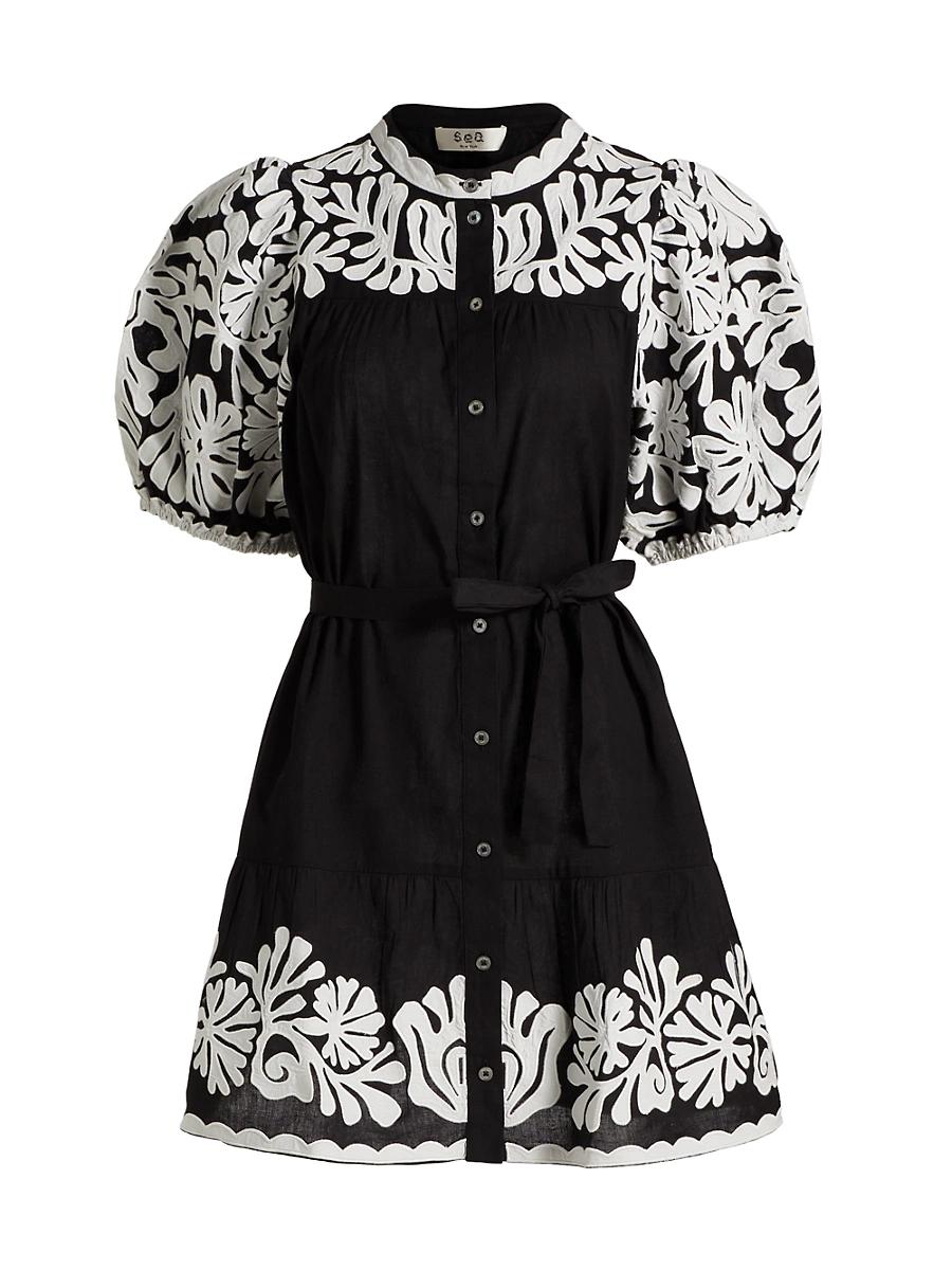 Seas charming puff-sleeve Agathe minidress showcases contrasting lace-like appliqus applied to the yoke and skirt hem. This piece showcases a banded crewneck, self-tie belt, and button-front closure. Crewneck Short puff sleeves, banded cuffs Self-tie belt Button-front closure 100% polyester Dry clean Imported SIZE & FIT About 35.25 from shoulder to hem Bust: about 32 Waist: about 30 Model measurements: 510 tall Model is wearing a US size Small Please Note: Compared to the Brands Size Guide, this style measures true to size. Contemporary Sportswear - Workshop > Sea > Saks Fifth Avenue > Barneys. Sea. Color: Black. Size: Small.
