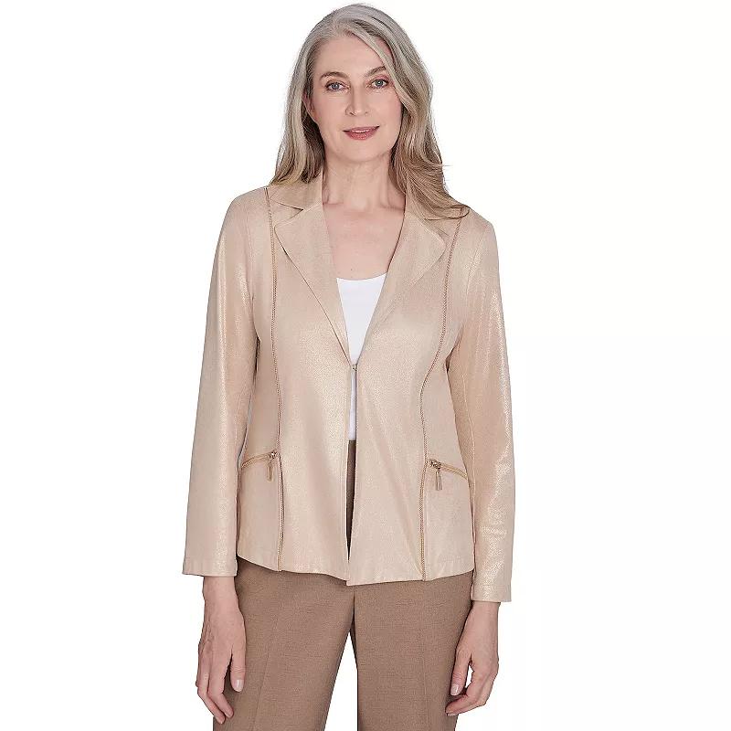 This lightweight womens jacket from Alfred Dunner feels luxurious yet is practical, offering both style and versatility for various occasions. Its combination of shimmering fabric, stretchy comfort, and thoughtful details (like spacious pockets) make it a standout piece in any wardrobe.Click on this WOMENS GUIDE to find the perfect fit and more! This lightweight womens jacket from Alfred Dunner feels luxurious yet is practical, offering both style and versatility for various occasions. Its combination of shimmering fabric, stretchy comfort, and thoughtful details (like spacious pockets) make it a standout piece in any wardrobe.Click on this WOMENS GUIDE to find the perfect fit and more! FEATURES Open neckline Long sleeves No closure - open front 24 1/4-in. length from shoulder to hemFABRIC & CARE Polyester Machine wash and tumble dry Imported Size: Large. Color: Champagne. Gender: female. Age Group: adult. Material: leather.
