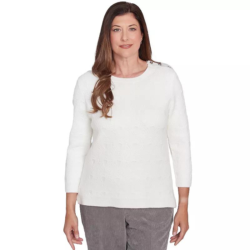 Crafted from durable materials, this textured long sleeve, knit top adds a layer of interest that is unique to this style.Click on this WOMENS GUIDE to find the perfect fit and more! Crafted from durable materials, this textured long sleeve, knit top adds a layer of interest that is unique to this style.Click on this WOMENS GUIDE to find the perfect fit and more! FEATURES Crewneck 3/4-length sleeves No closure - pullover stylingFIT & SIZING 22 1/2-in. length from shoulder to hemFABRIC & CARE Rayon, polyester, nylon Hand wash and line dry Imported Size: M Petite. Color: Winter White. Gender: female. Age Group: adult.