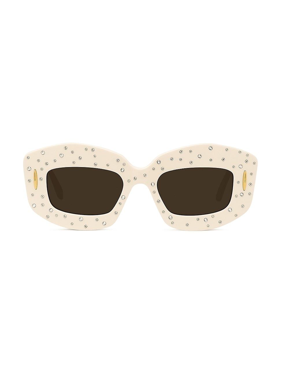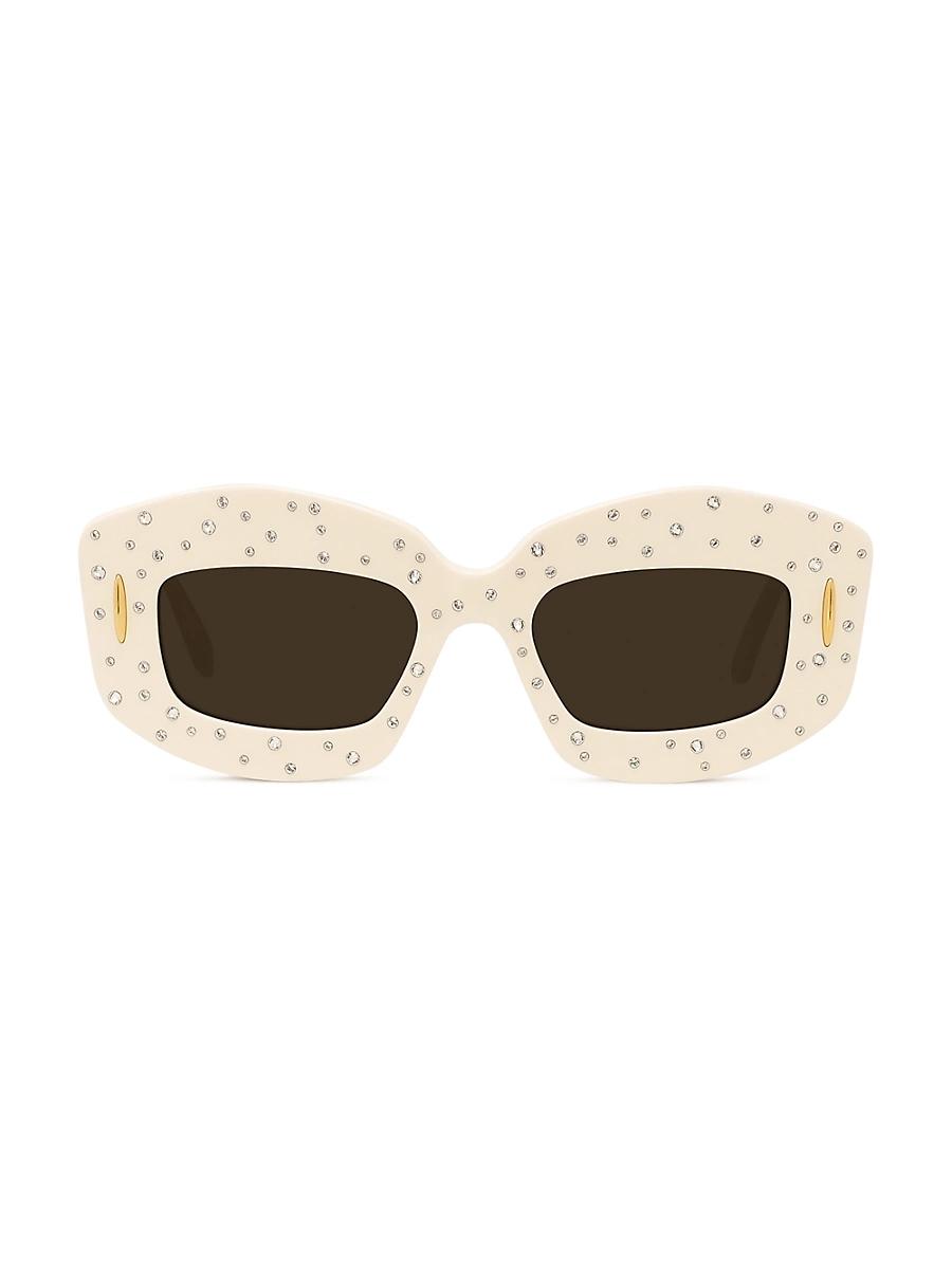 Crafted in Italy, LOEWEs Anagram sunglasses boast chunky rectangular frames and goldtone logo detailing at the temples. Scattered crystal embellishments complete the look. 100% UV protection Solid lenses Acetate Case and cleaning cloth Made in Italy SIZE 49mm lens width 19mm bridge width 140mm temple length. Soft Accessories - Sunglasses > Loewe > Saks Fifth Avenue > Barneys. LOEWE. Color: Shiny Ivory Strass Smoke.